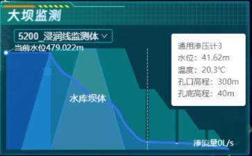 - 大坝监测:显示工程下各个浸润线监测体监测数据(包含:当前水位、温度、孔口高程、孔底高程、渗流量);
