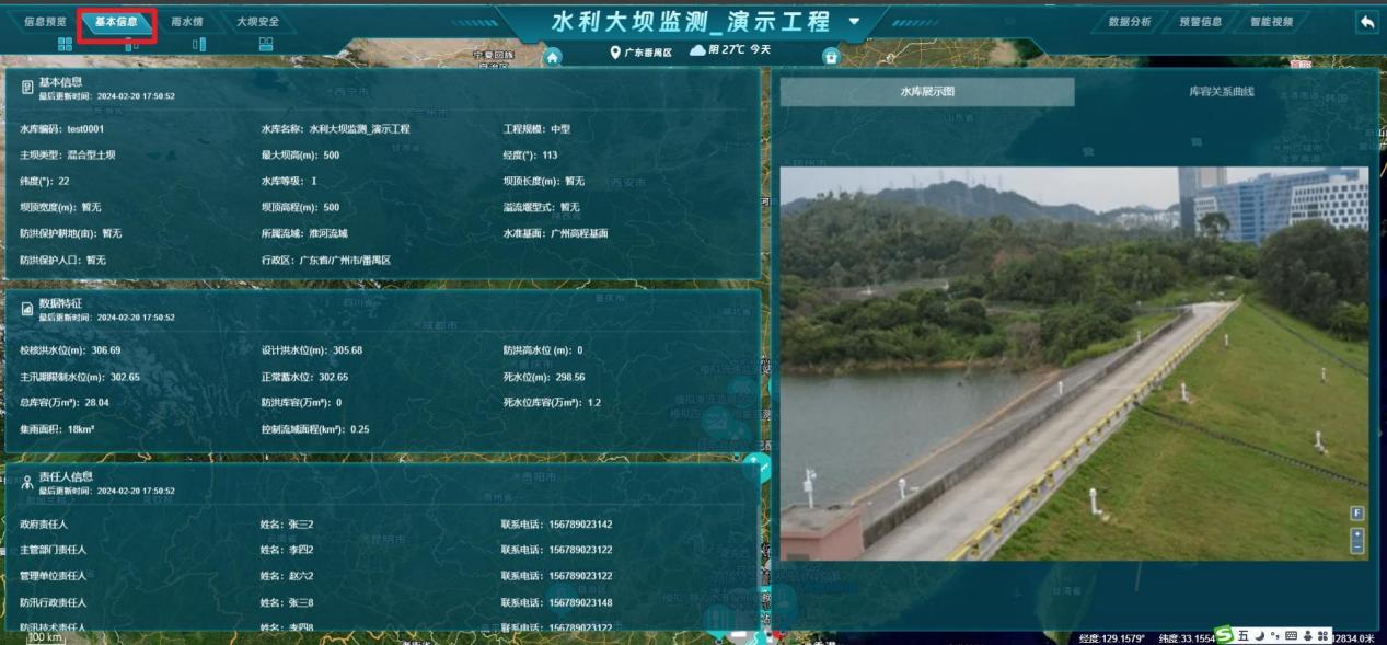 - 基本信息:显示当前工程基本信息、数据特征、责任人信息、水库演示图、库容关系图表;