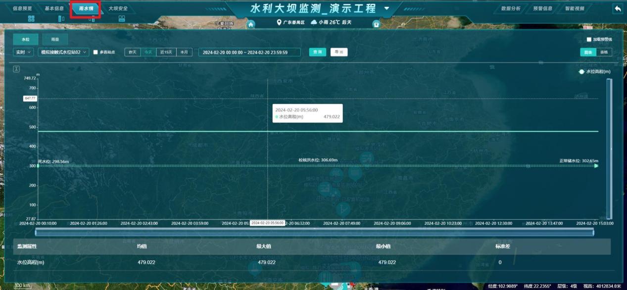 - 雨水情:显示当前工程【水位、雨量】站点监测数据,可切换图表/表格查看监测数据;