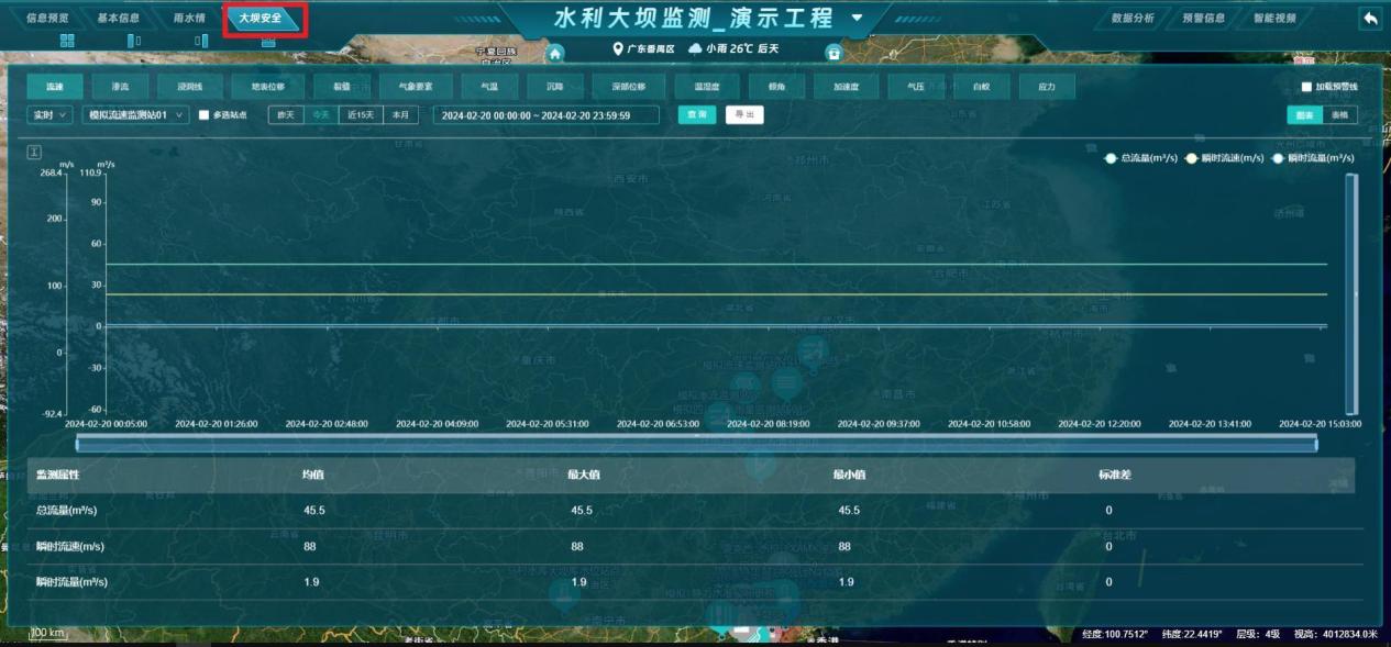 - 大坝安全:显示当前工程地表位移、渗流、浸润线等站点的监测数据,可切换图表/表格查看监测数据;