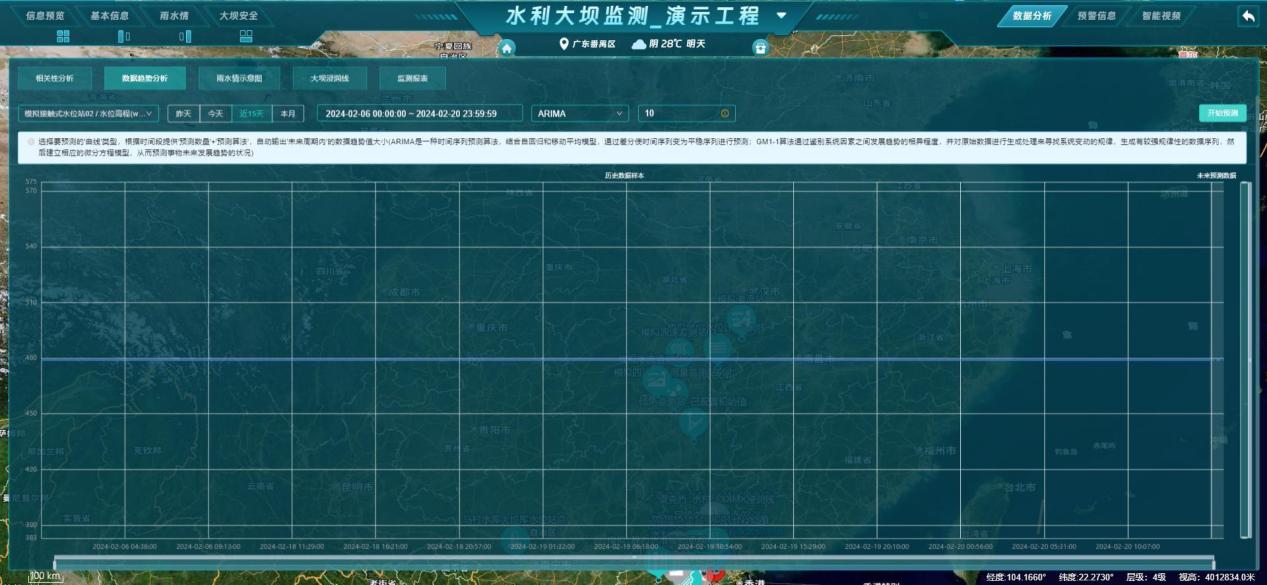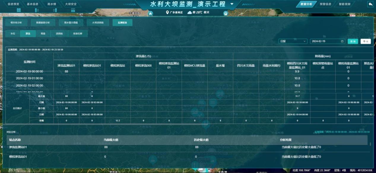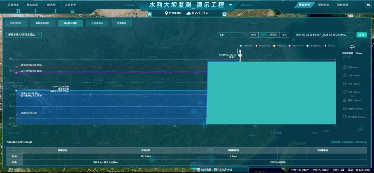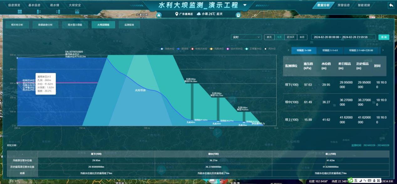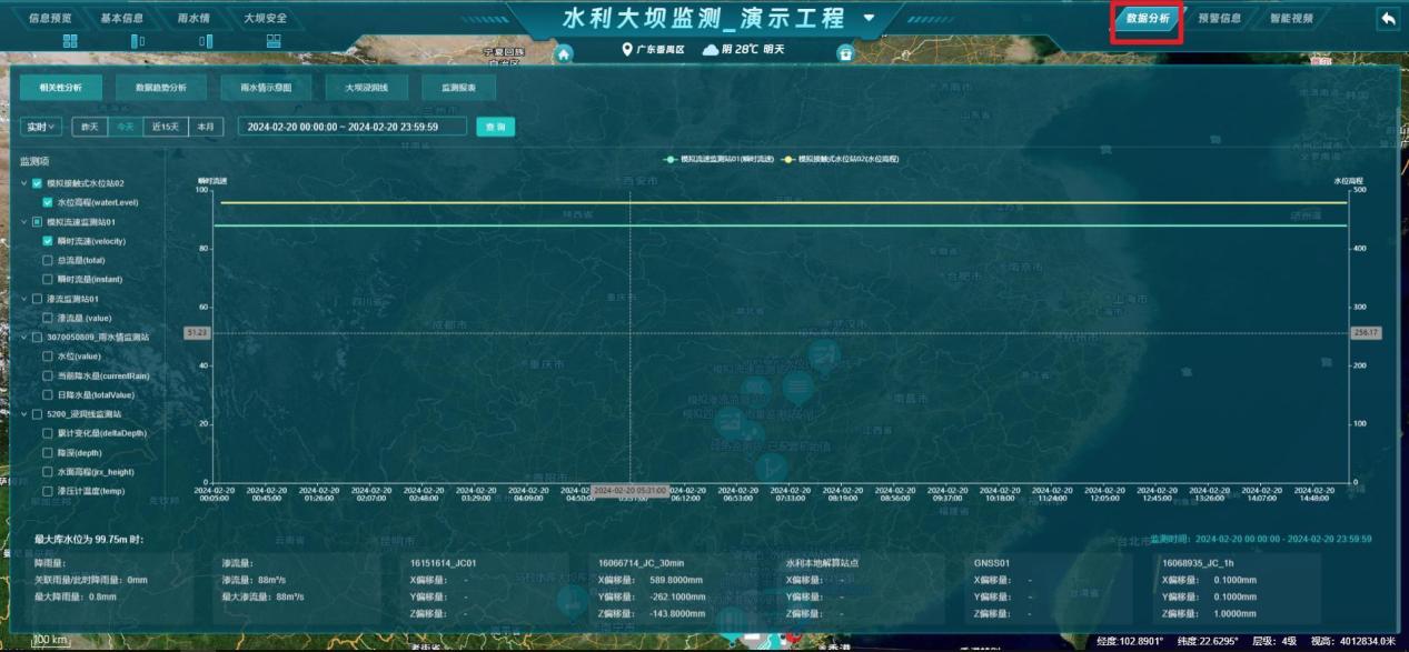 - 数据分析:展示当前工程的【相关性分析、数据趋势分析、雨水情示意图、大坝浸润线、监测报表】等分析图表;