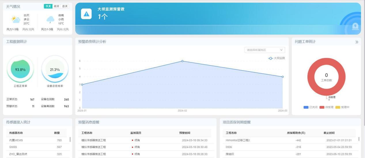 【操作说明】 登录平台,默认跳转到【首页】,首页包含:天气情况、工程数据统计、传感器接入统计、行业预警数量统计、预警趋势统计分析、预警消息提醒、项目质保到期提醒、问题工单统计。