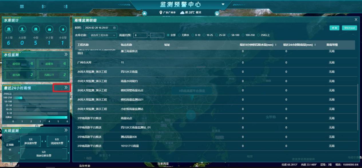 5、最近24小时雨情:显示权限下各个水库雨情监测情况,并根据雨量范围,对水库进行分组统计;