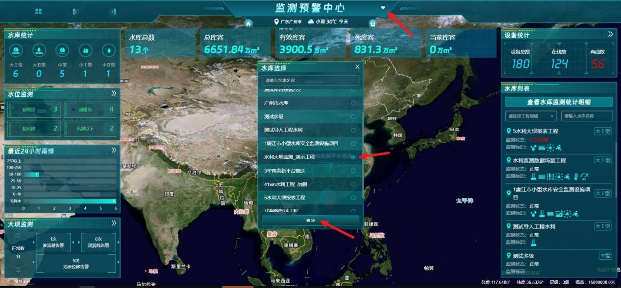 【操作说明】顶部导航栏选择”水利监测”行业,和工程,进入”GIS大屏”