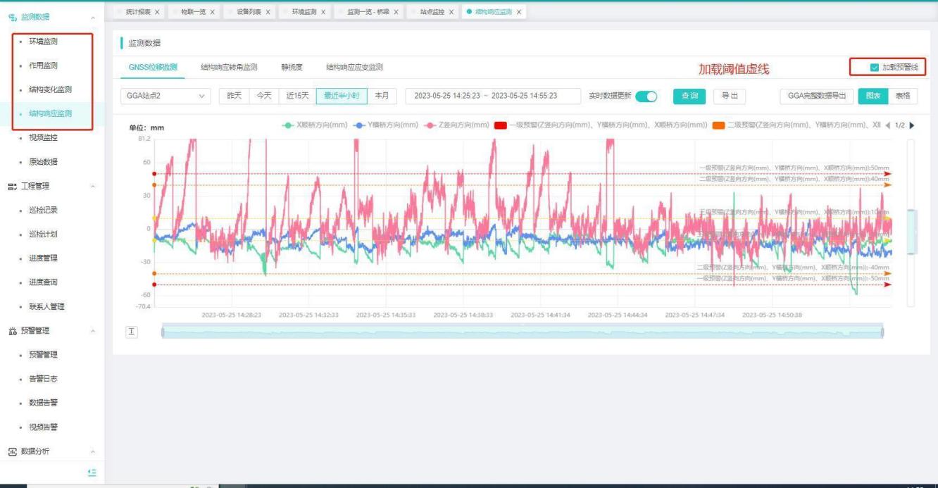 2. 监测数据默认不加载预警线,勾选【加载预警线】即可展示,