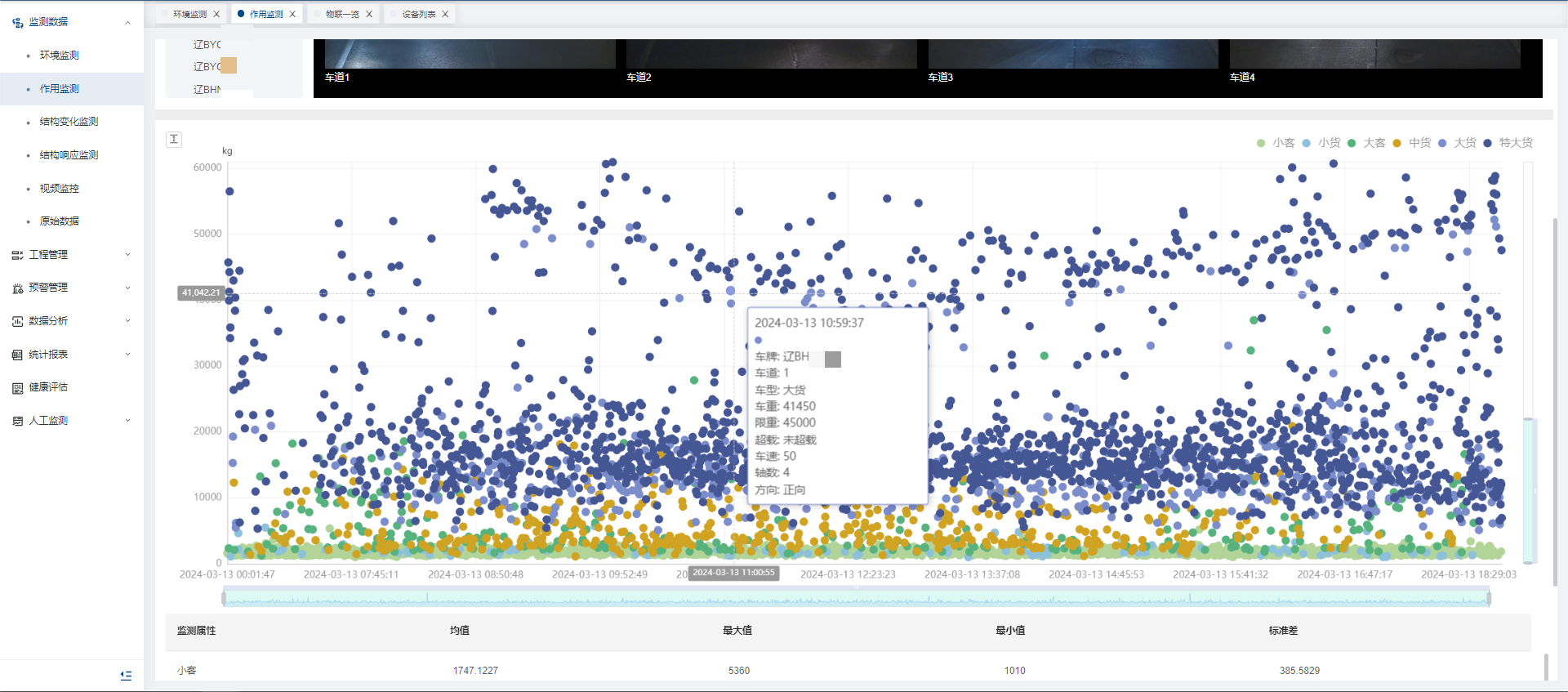 【功能说明】车辆荷载是监测每一辆经过桥梁的车辆的重量,通过荷载传感器进行采集,将采集到的车辆数据上传到平台进行