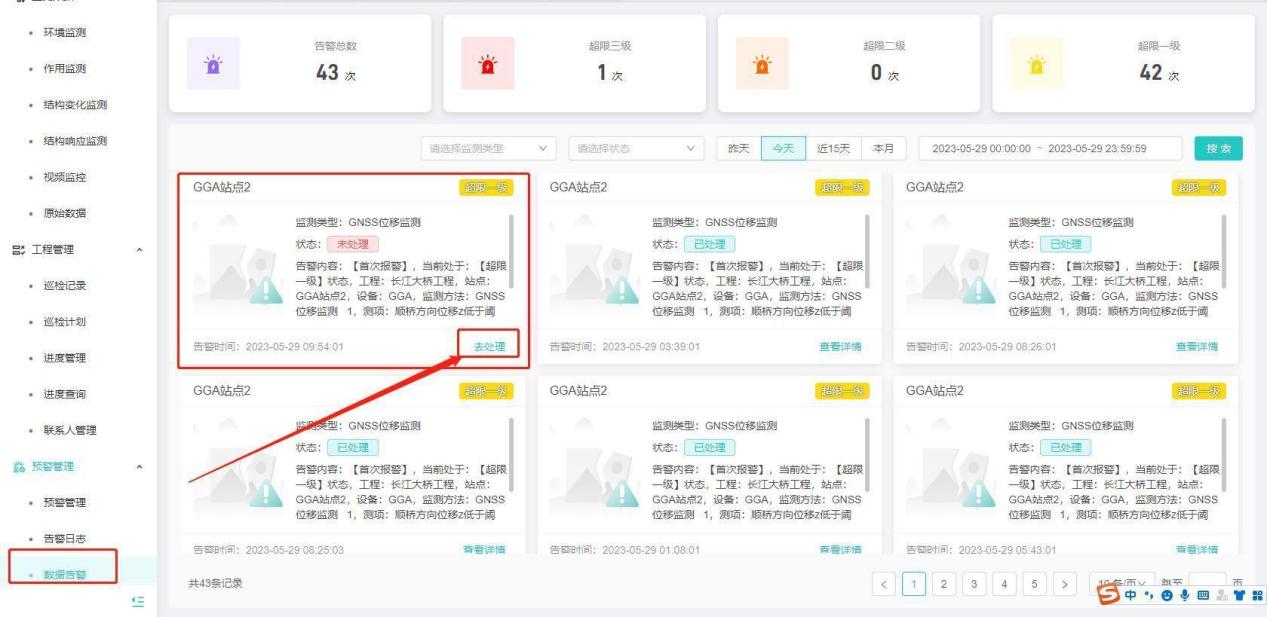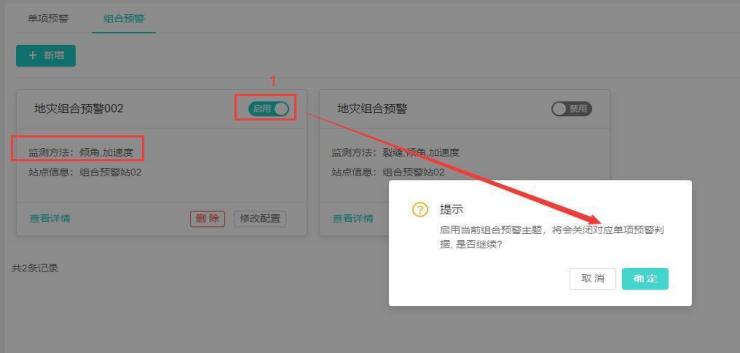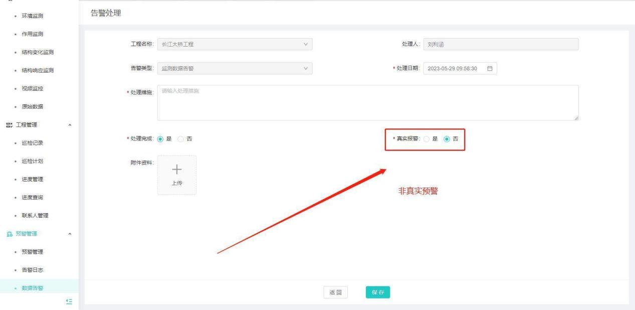 站点触发预警时均记录在数据告警中,且站点未开启及时预警时可手动判断其预警是否为真实预警,是则报警,否则取消报警。