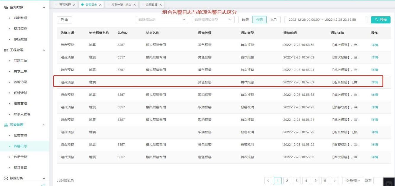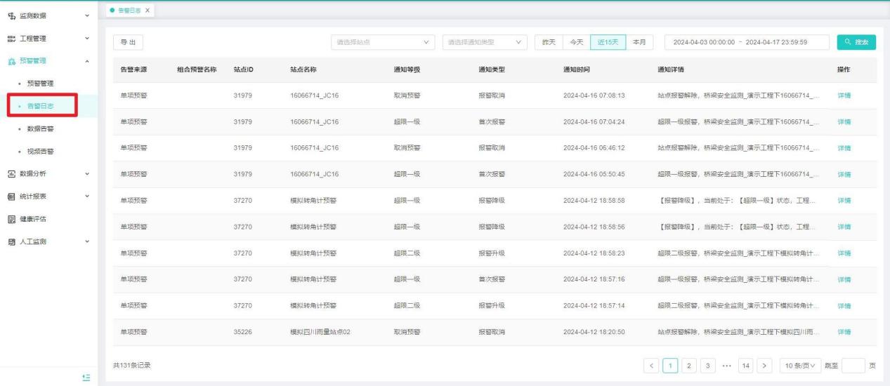 【操作说明】1、用户登录平台后进入【监测预警】子系统 “预警管理”-“告警日志”