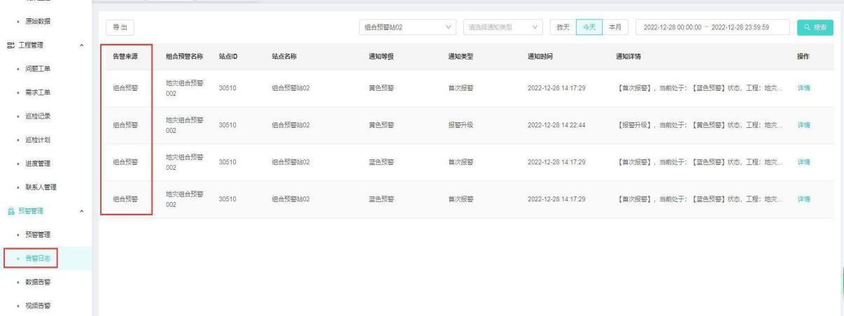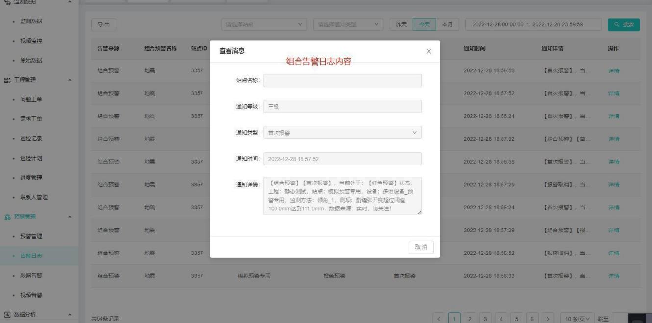 2、组合预警告警日志展示格式,可进行日志详情查看、导出、及搜索。