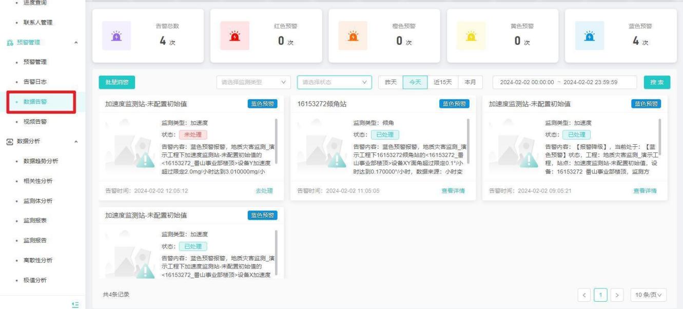 【操作说明】1、用户登录平台后进入【监测预警】子系统 “预警管理”-“数据告警”