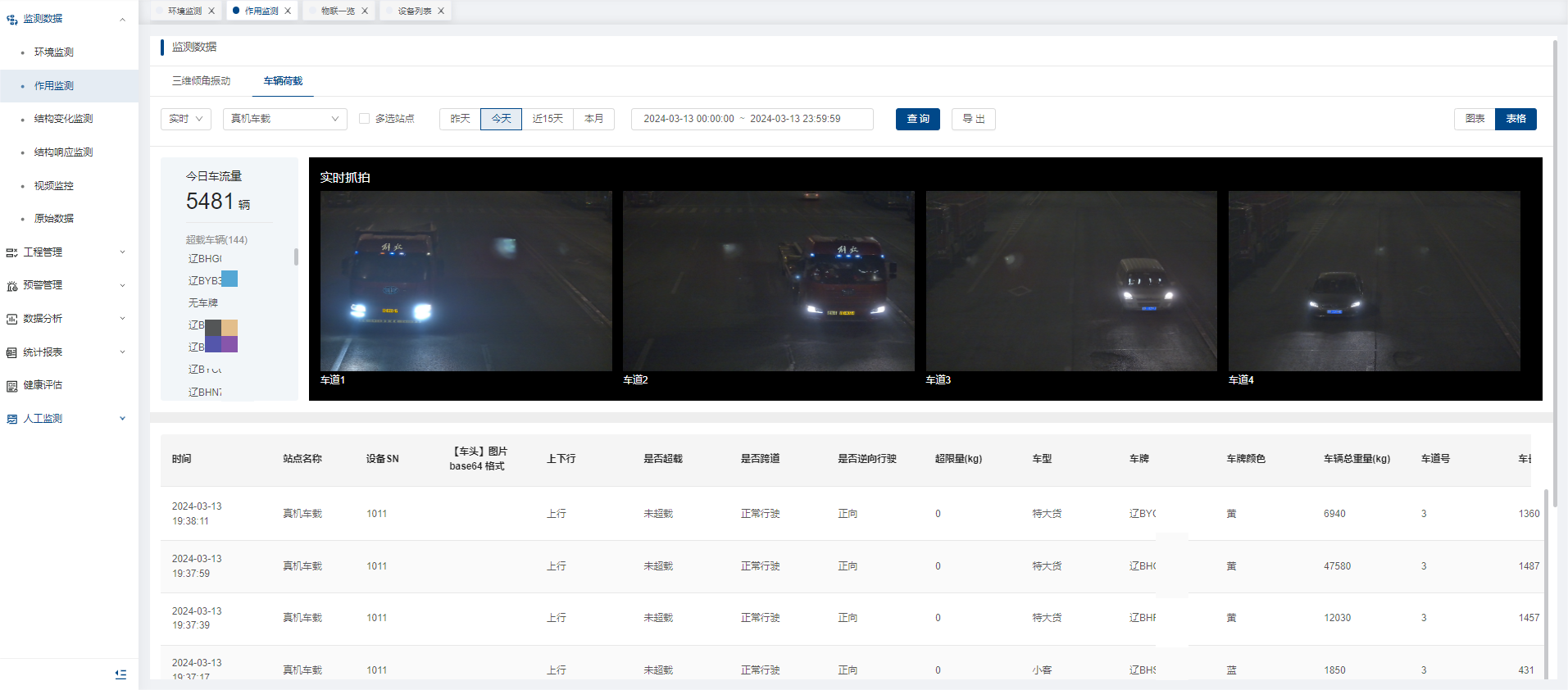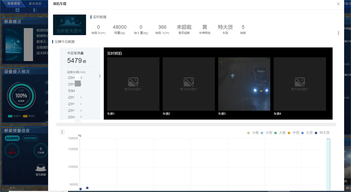 进入监测预警-作用监测,切换到车辆荷载监测方法。“今日车流量”中记录超重车辆的信息,实时抓拍展示经过抓拍设备拍到的所有车辆照片。