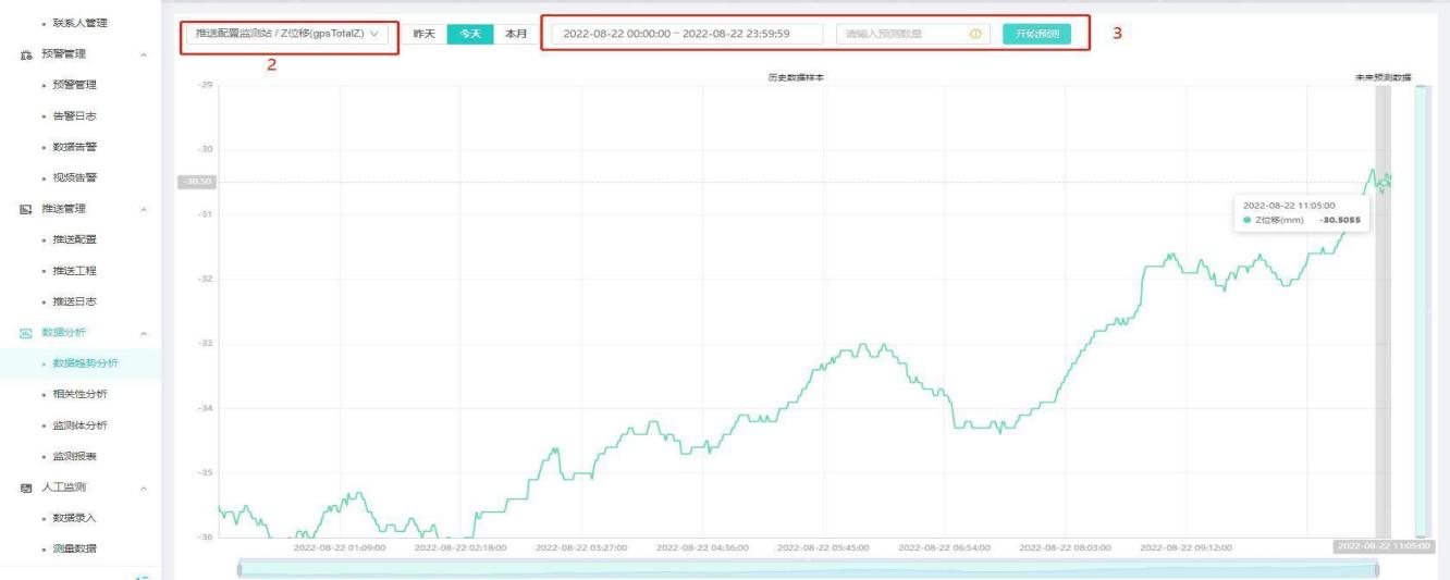 【操作说明】①选择需要预测其趋势的工程②选择其需要预测趋势的站点及监测方法下的测项③选择日期及预测值进行预测