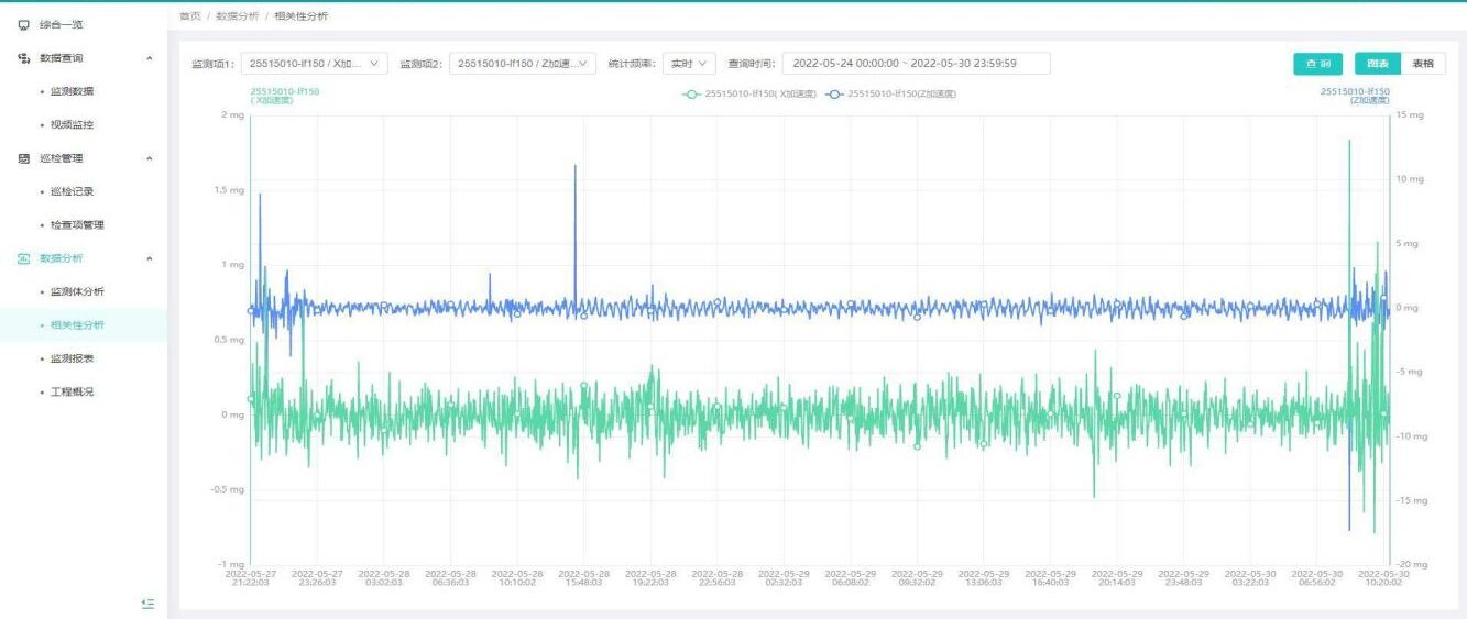 进入相关系分析,并通过选择不同站点的不同监测项,加载曲线图形,对比不同测项间的走势影响