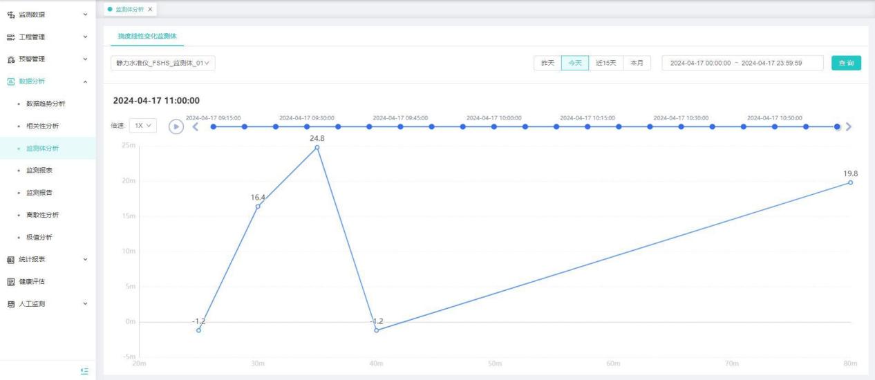 【操作说明】用户登录平台后进入【监测预警】子系统 “数据分析”,选择静挠度监测体,选择数据时间范围和播放倍速,点击播放可查看监测体数据变化情况。