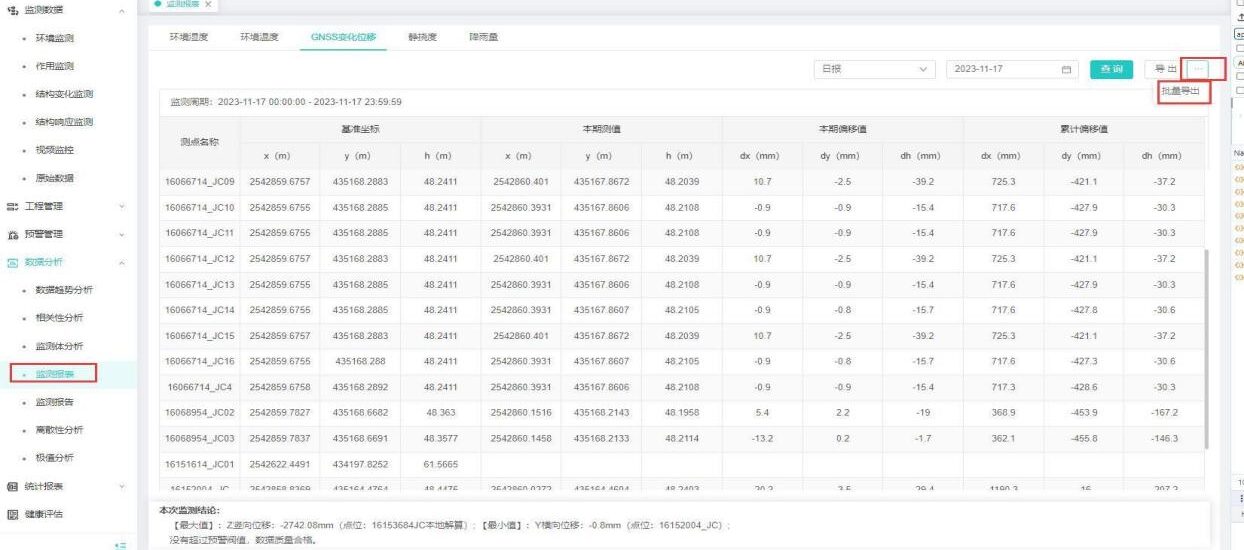 【功能说明】统计当前工程下各类型站点的监测情况,能以日报/周报/月报的形式查询报表统计结果,并且导出报表,批量导出可导出当前所有监测类型的报表数据,并显示本次监测结论。