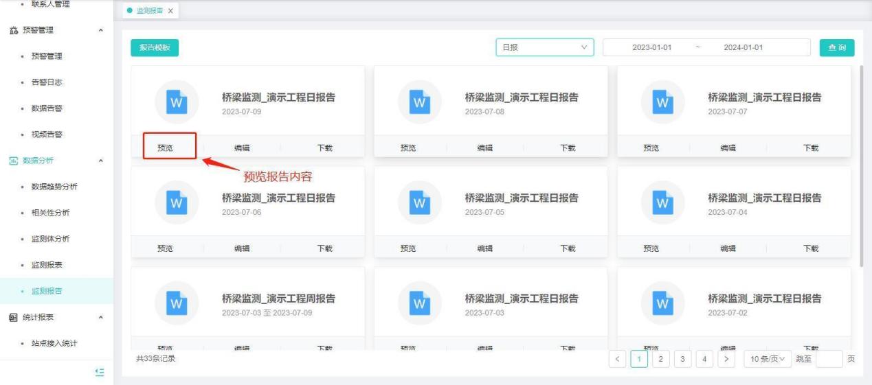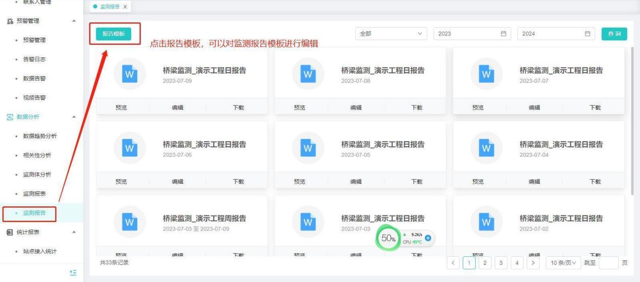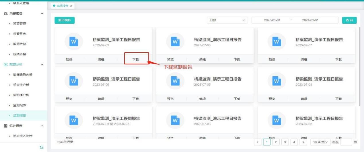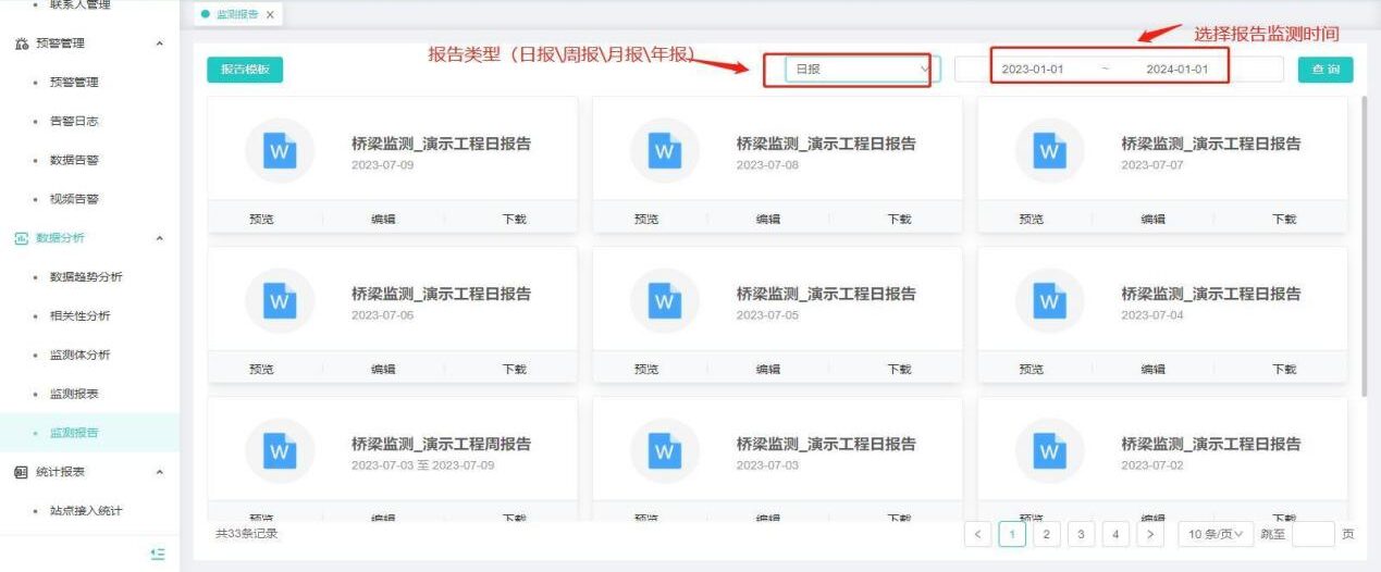 【操作说明】登录平台选择【桥梁行业】【监测预警】子系统 “数据分析”-“监测报告”