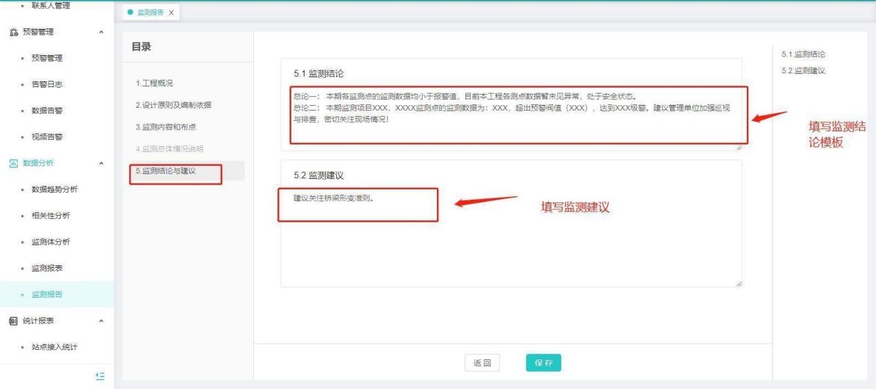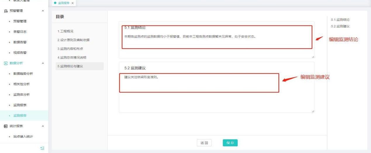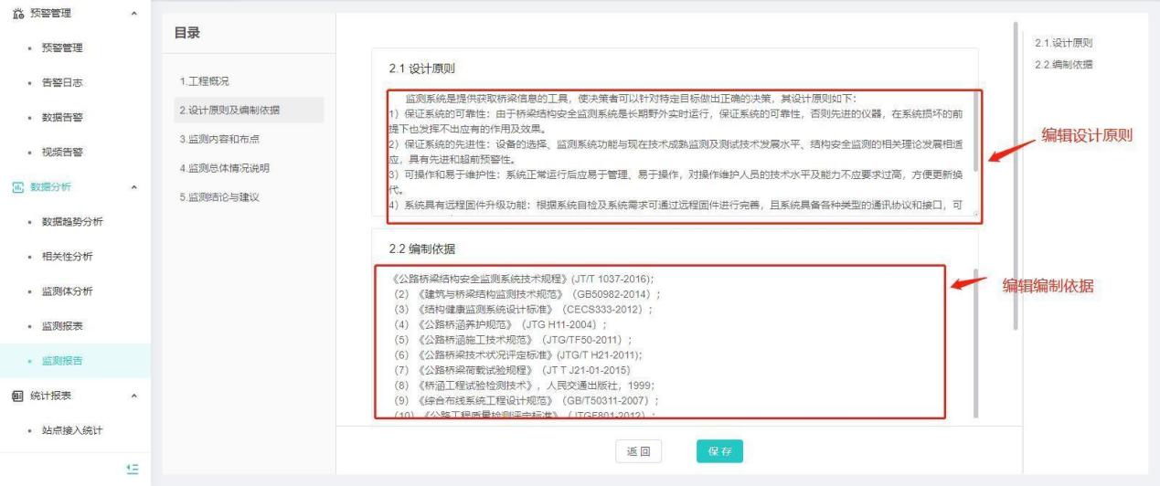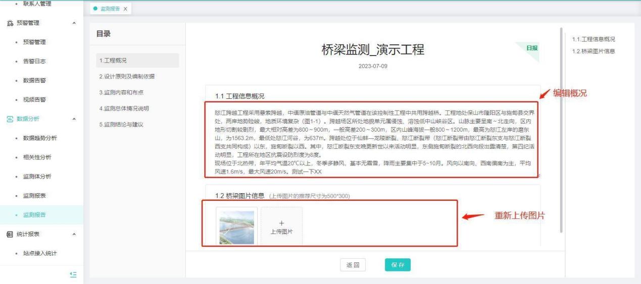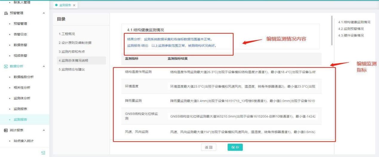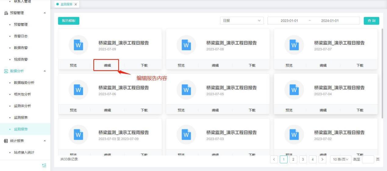 【功能说明】后台依据用户创建的监测报告模板,并对工程监测数据进行分析,输出工程的日/周/月/年监测报告。报告自动生成后,可以根据实际情况,对报告内容进行修改,也可以直接导出对应word格式的报告文档进行编辑修改。