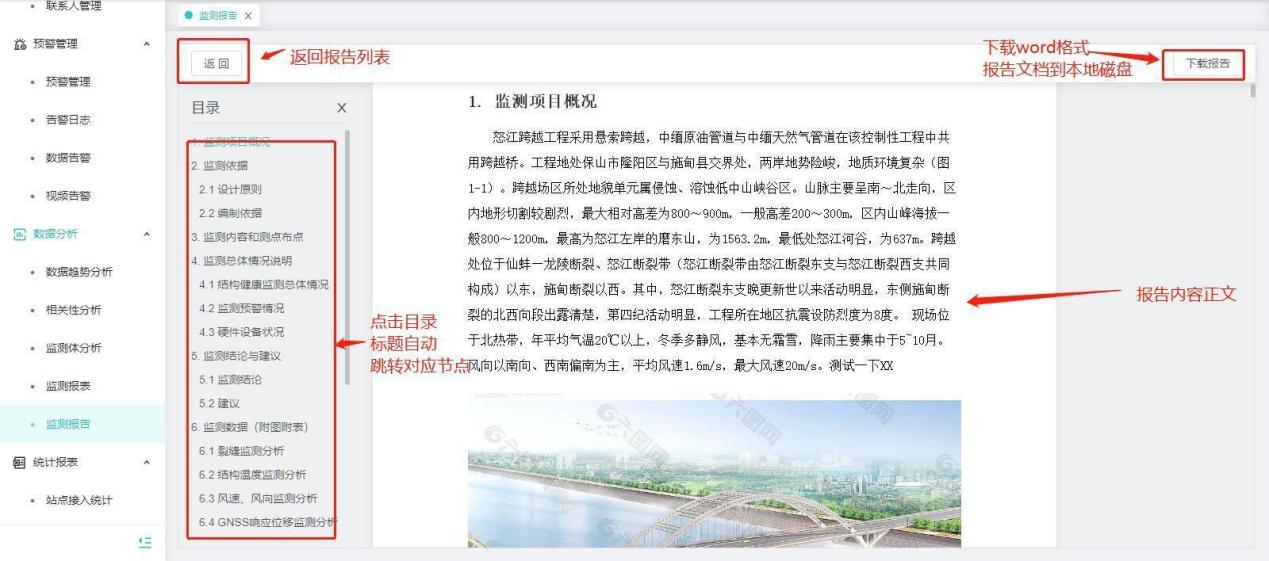 展示各个桥梁工程下的日/周/月/年监测报告,报告内容为:监测项目概况、监测依据、监测内容和测点布点、监测总体情况说明、监测结论与建议、监测数据(附图附表)