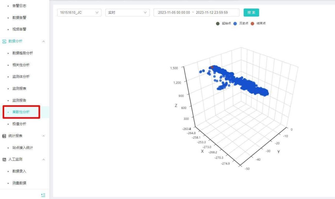 【操作说明】用户登录平台后进入监测预警-数据分析-离散性分析,选择站点和查看数据的时间,点击搜索,查看站点数据的离散点分部展示情况。