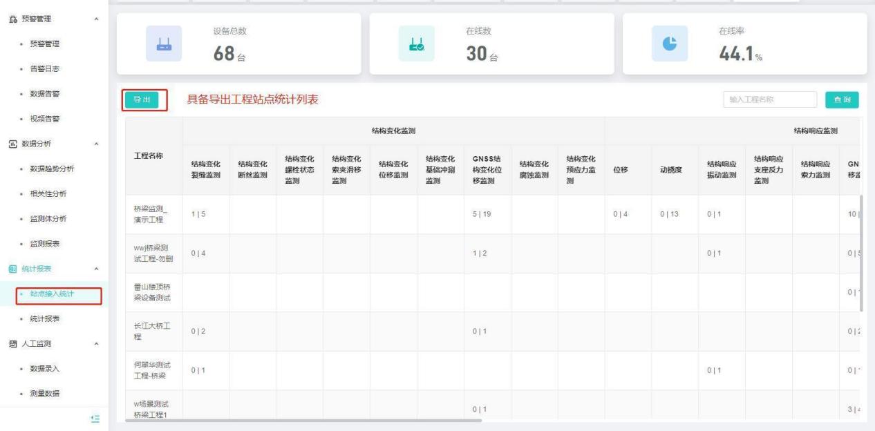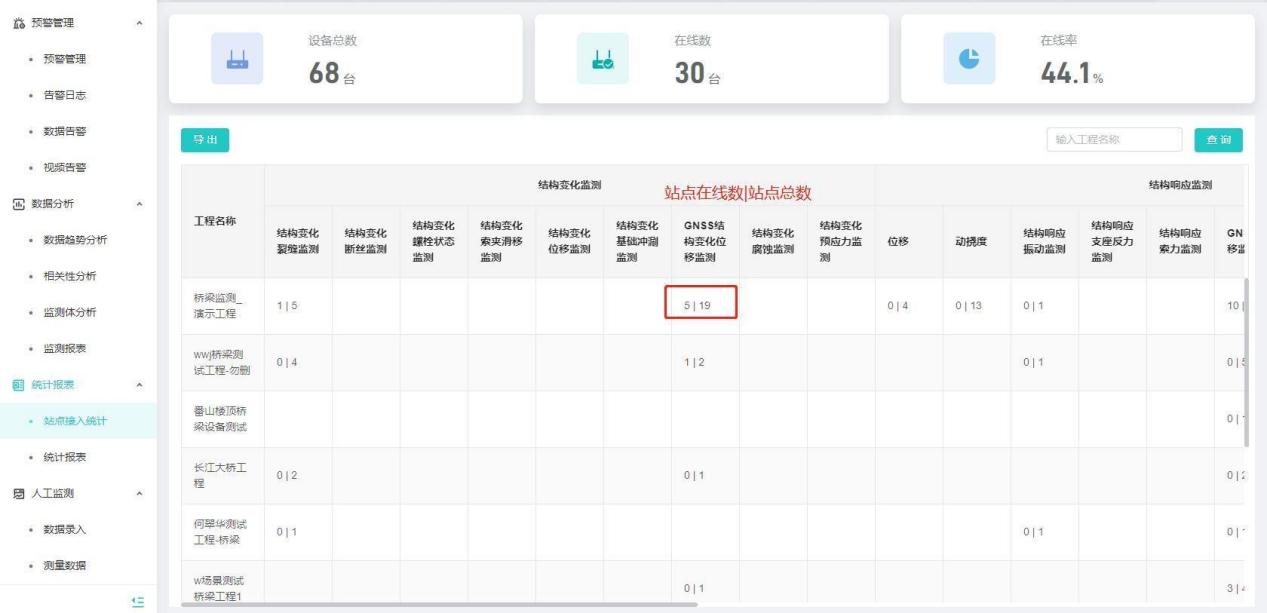 【操作说明】登录平台选择【桥梁行业】【监测预警】子系统 “统计报表”-“站点接入统计”