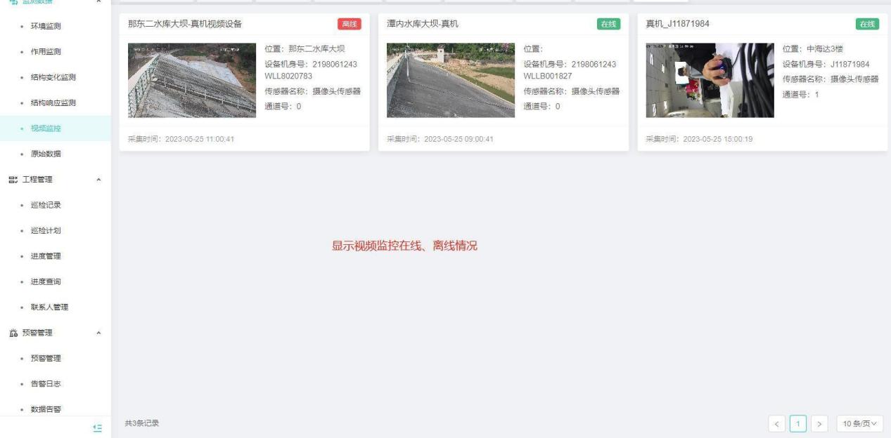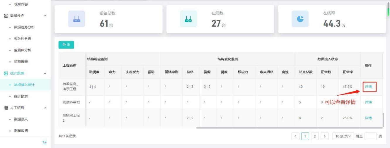 展示各个桥梁工程下的所有站点运行情况,可以查看站点状态、查看站点设备总数、在线数、在线率等信息