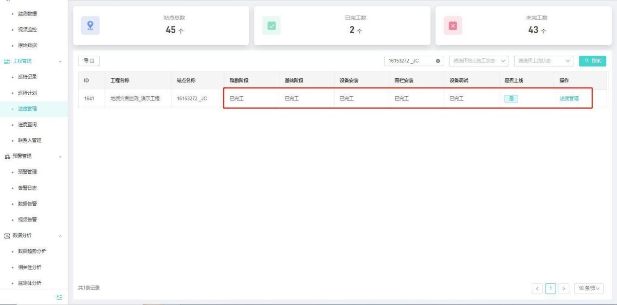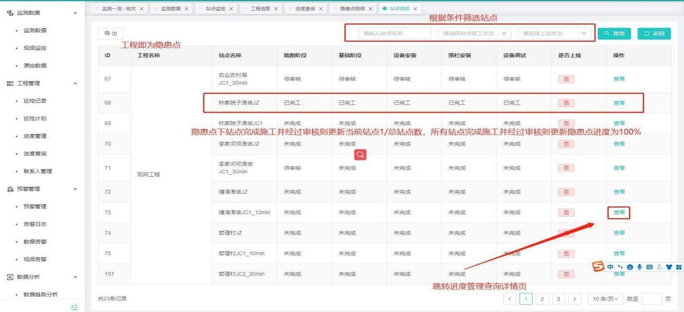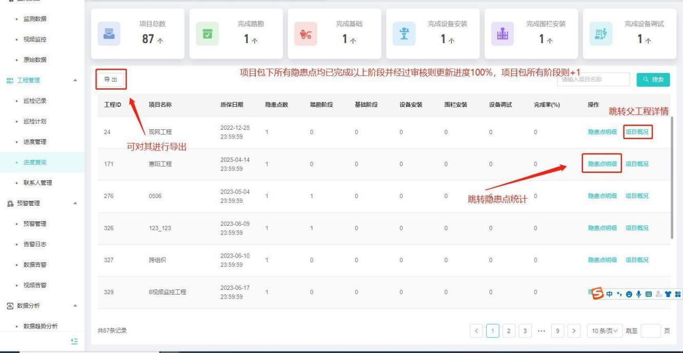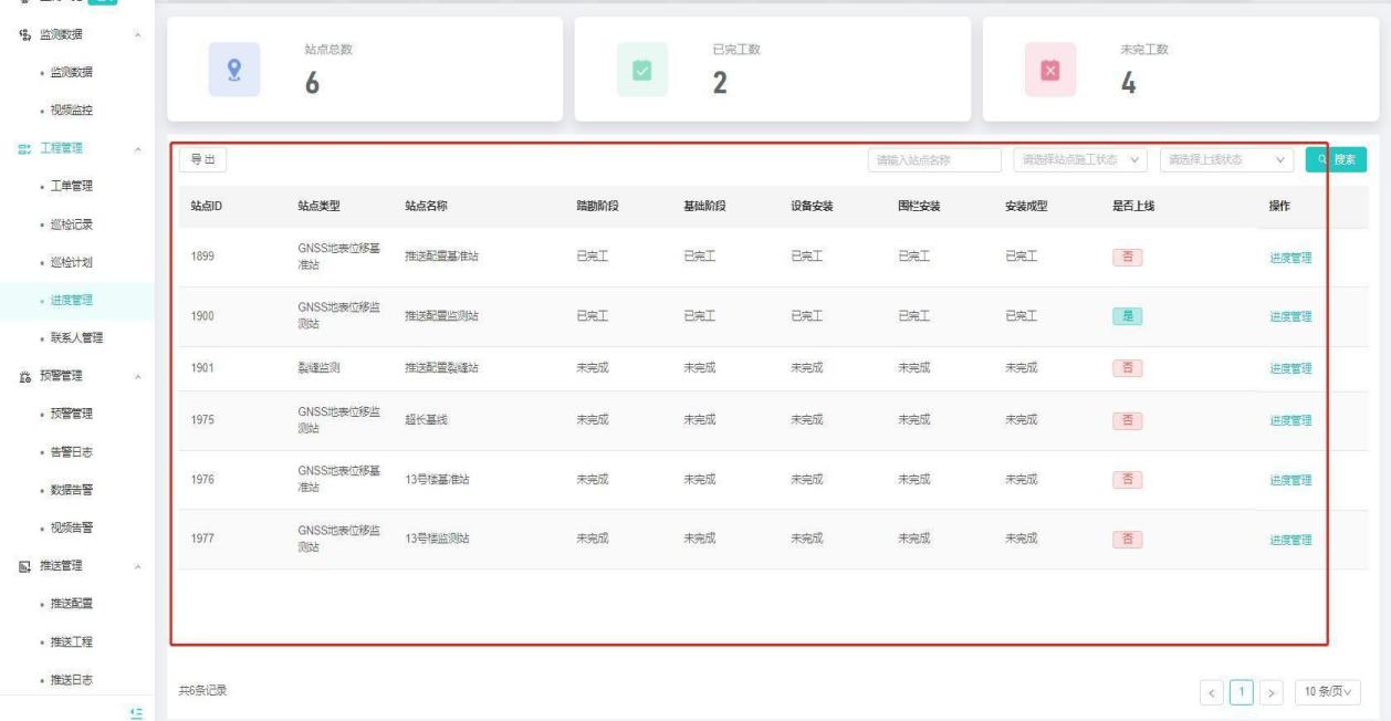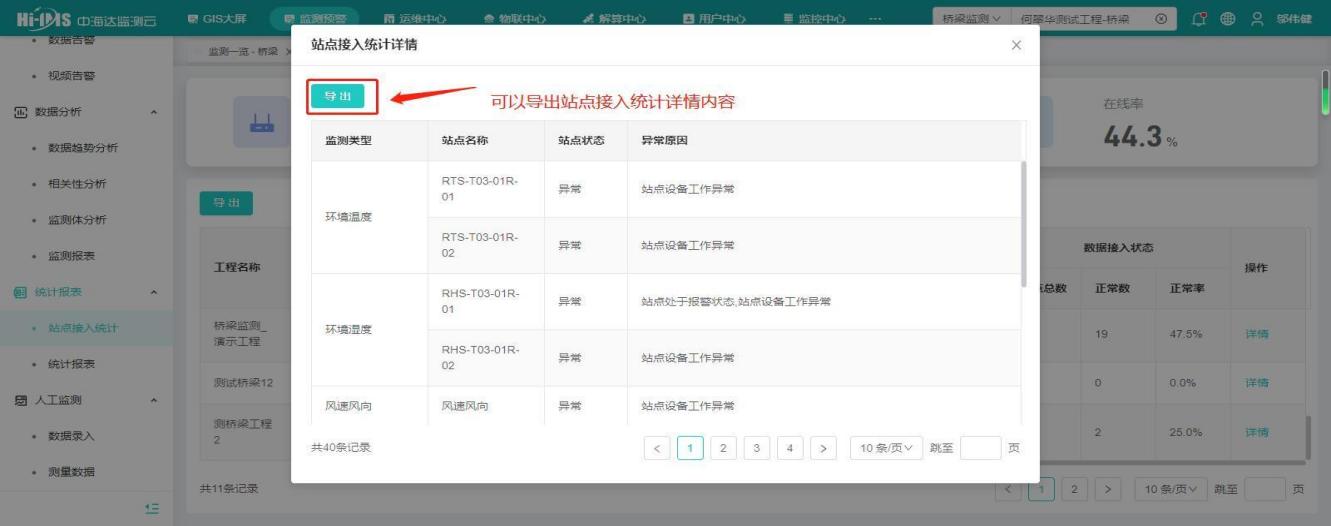 点击【详情】,可以查看单个工程下各个站点状态信息,且可以导出相关信息。