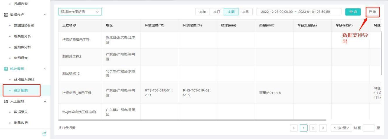 【功能说明】用于导出桥梁工程下的环境与作用监测及结构变化、结构响应监测数据报表,并可对其进行日、周、月、年度查询报表数据
