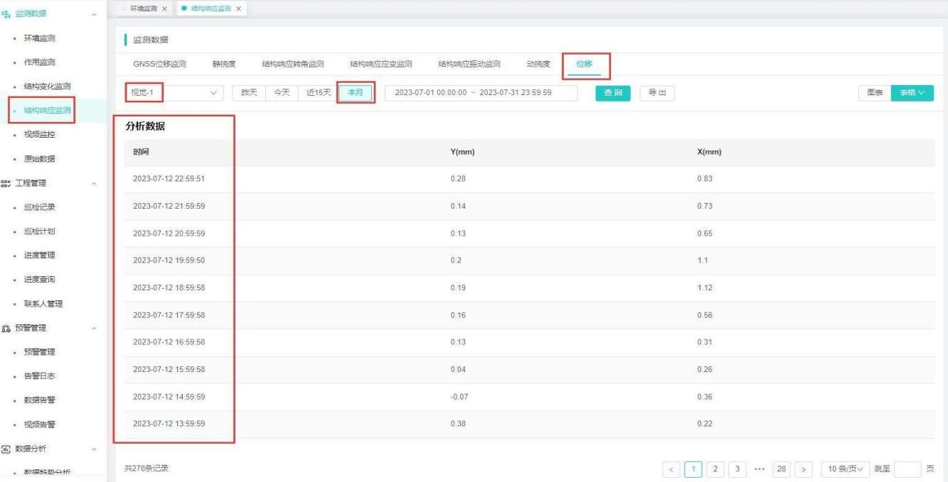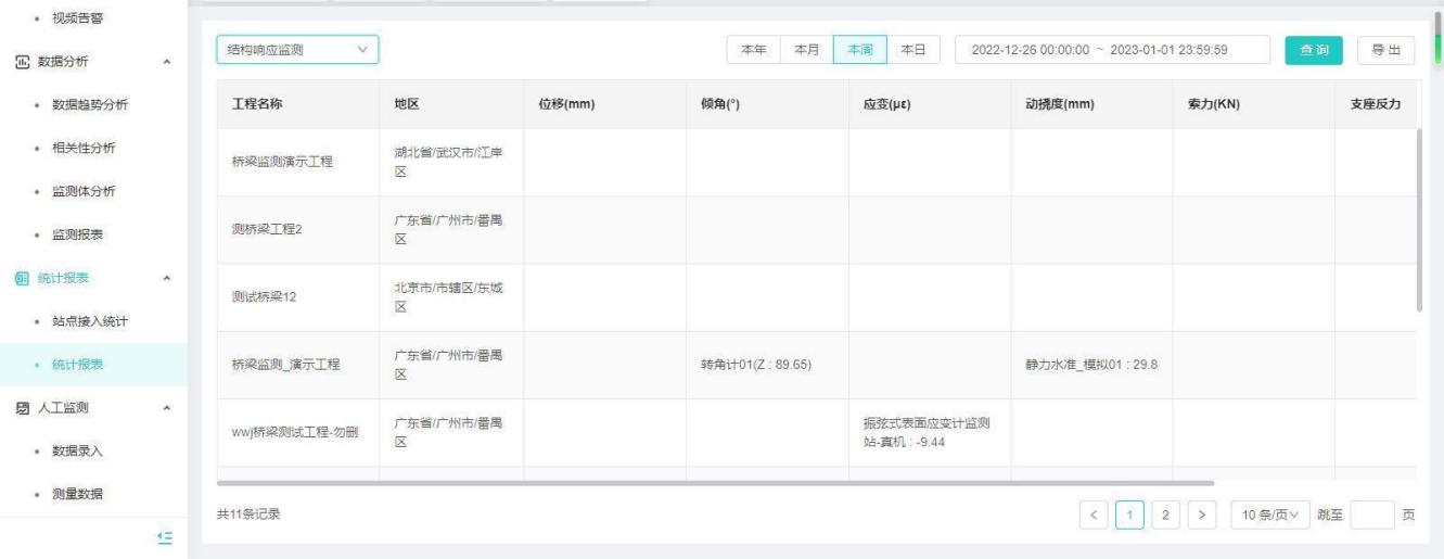 【功能说明】桥梁行业结构响应监测类型数据详情展示 如:查询、日查询、周查询、月查询、统计查询等