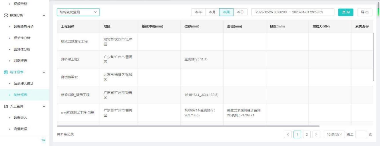 【功能说明】桥梁行业结构变化监测类型数据详情展示 如:查询、日查询、周查询、月查询、统计查询等