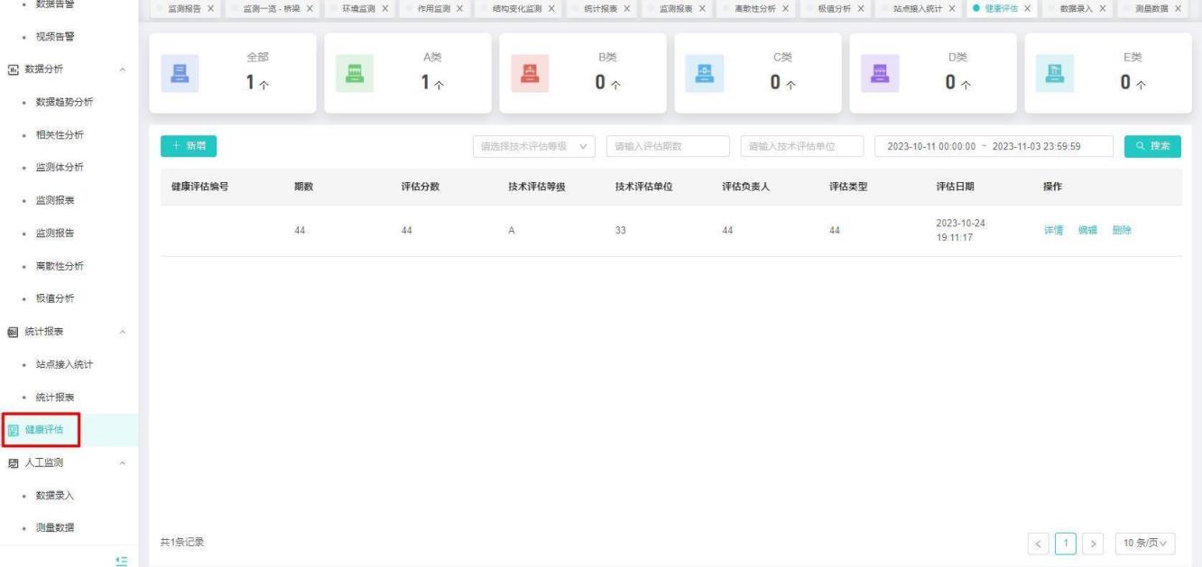 - 用于记录评估桥梁的健康状况,能对列表中的评估状况进行新增、详情查看、编辑、删除,可根据搜索条件进行筛选,顶部卡片显示技术评估等级汇总情况