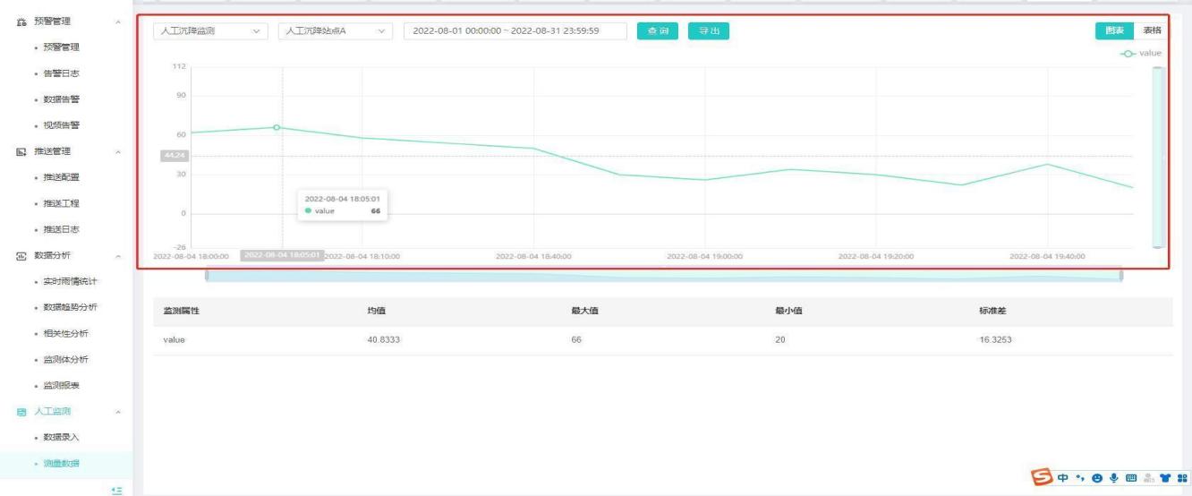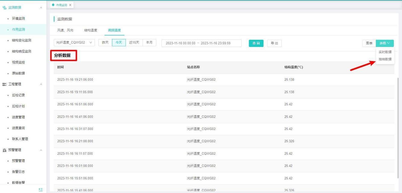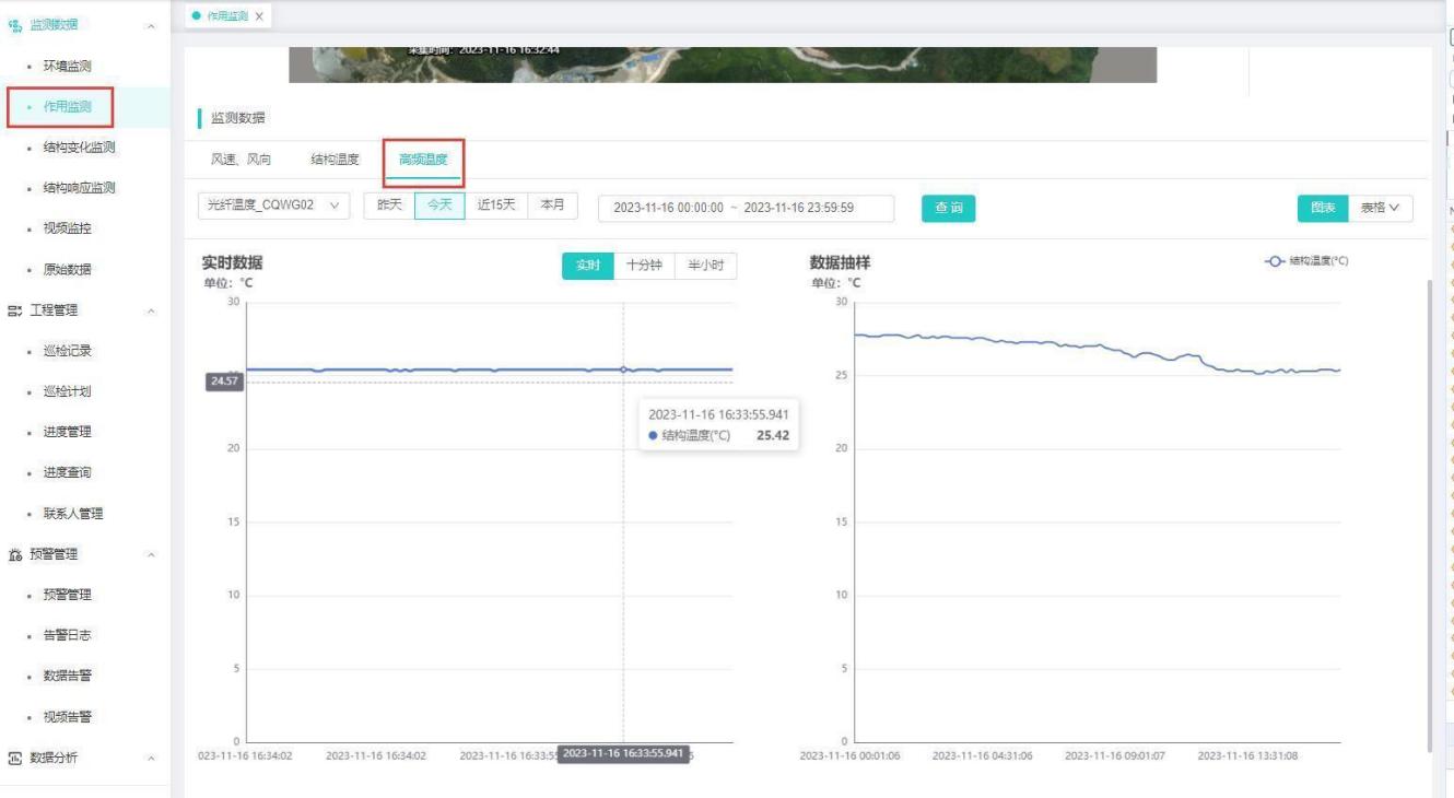 进入【监测预警】-监测数据-作用监测,站点类型选择【高频温度】,选择站点和时间,点击查询,切换图表和表格查看数据展示。