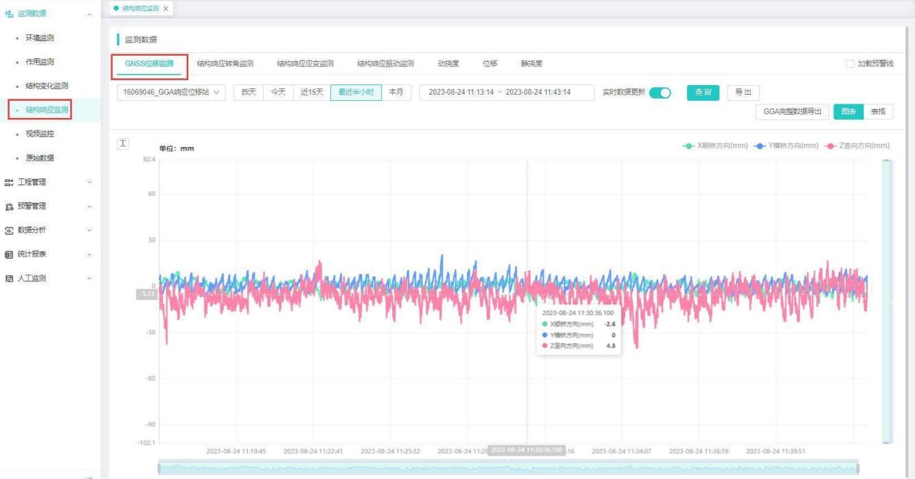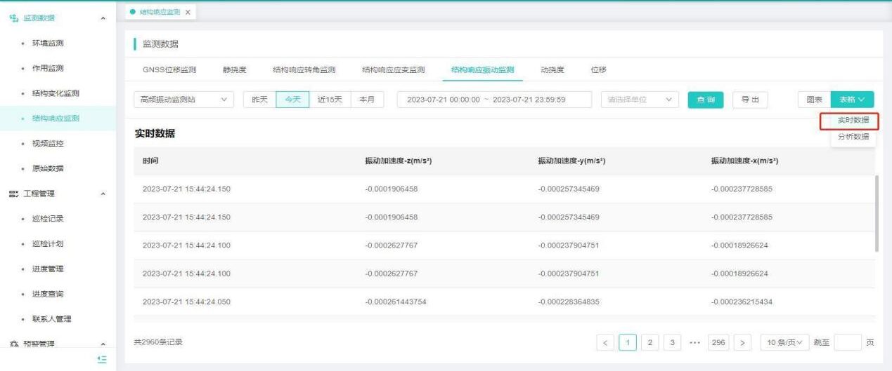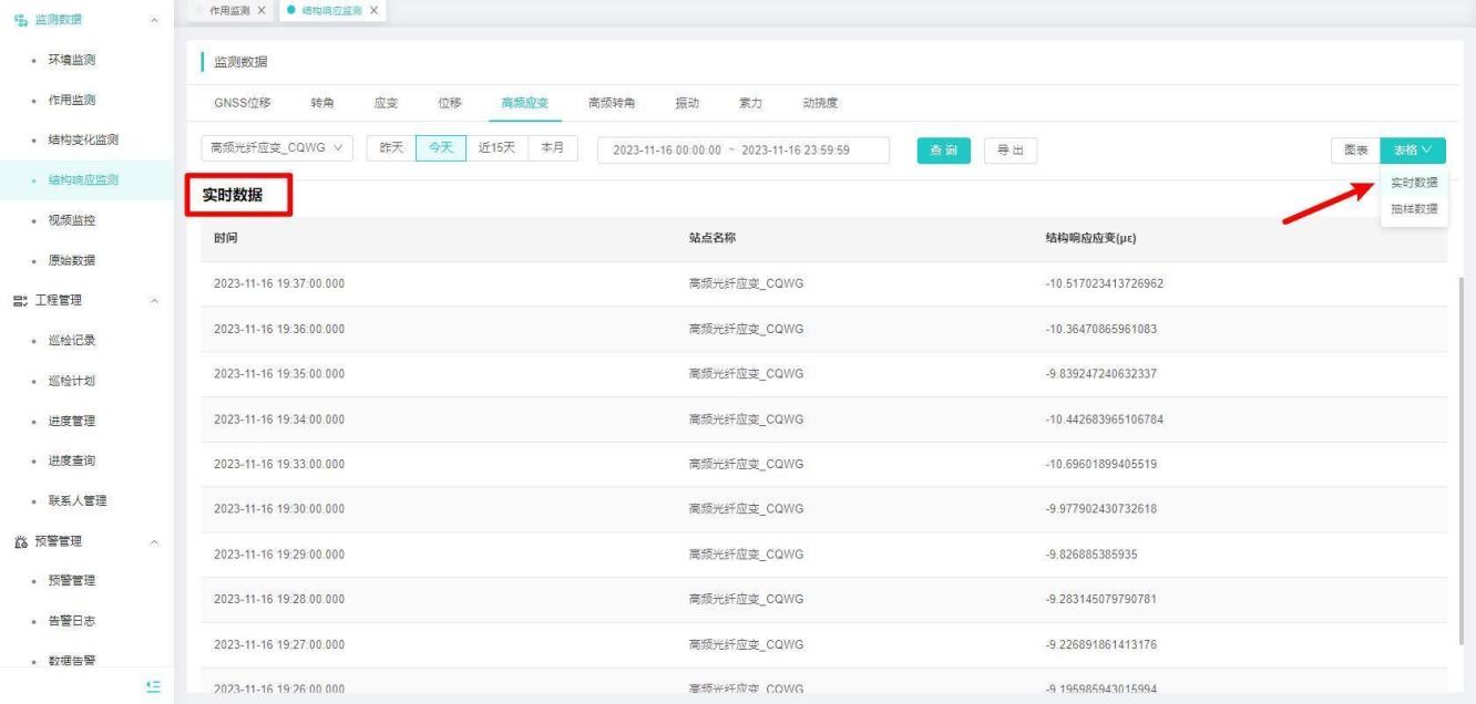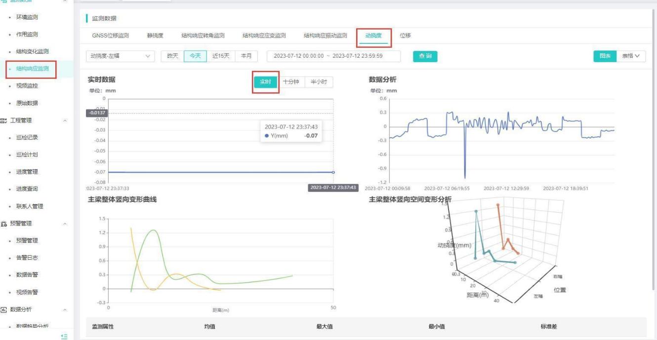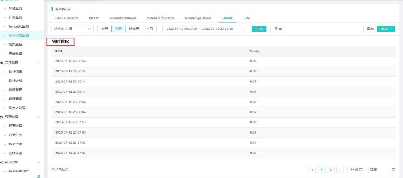 实时数据:只展示当天的最新数据,可按照(1分钟)、10分钟、30分钟三个时间维度查询,仅限加载当前最新三个时间区间内的高动态实时数据(当前挠度高频数据按20HZ显示),不作数据抽稀且不受检索条件的“选择时间段”限制。表格/图表中均一致。