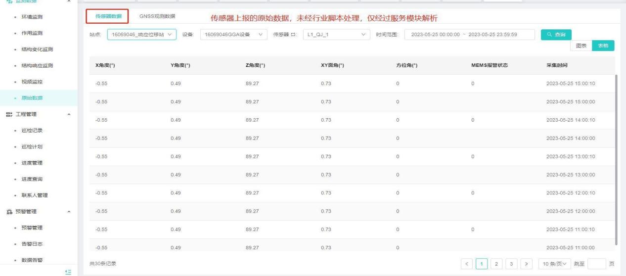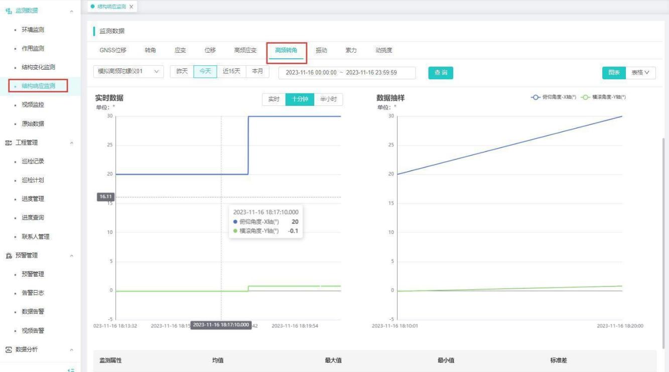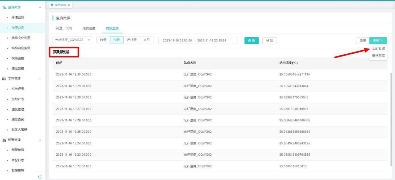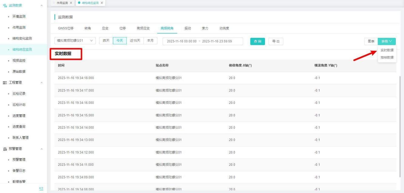 实时数据:只展示当天的最新数据,可按照(1分钟)、10分钟、30分钟三个时间维度查询,仅限加载当前最新三个时间区间内的高动态实时数据(当前挠度高频数据按20HZ显示),不作数据抽稀且不受检索条件的“选择时间段”限制。表格/图表中均一致。