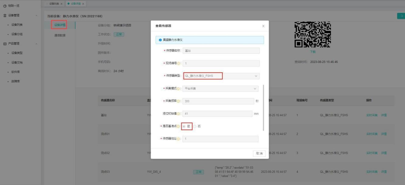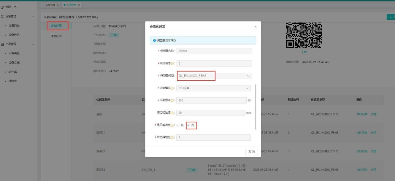 1、进入【物联中心】点击【新增】,产品类型选择【DTU】,新增传感器,传感器类型为【QL_静力水准仪_FSHS】,新增多个水准仪,设置一个水准基站,多个水准测点。配置不同的传感器采集实时液位高度, 并可以配置每个设备的初始液位高度。