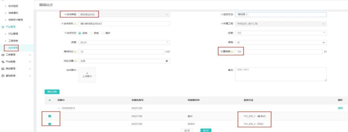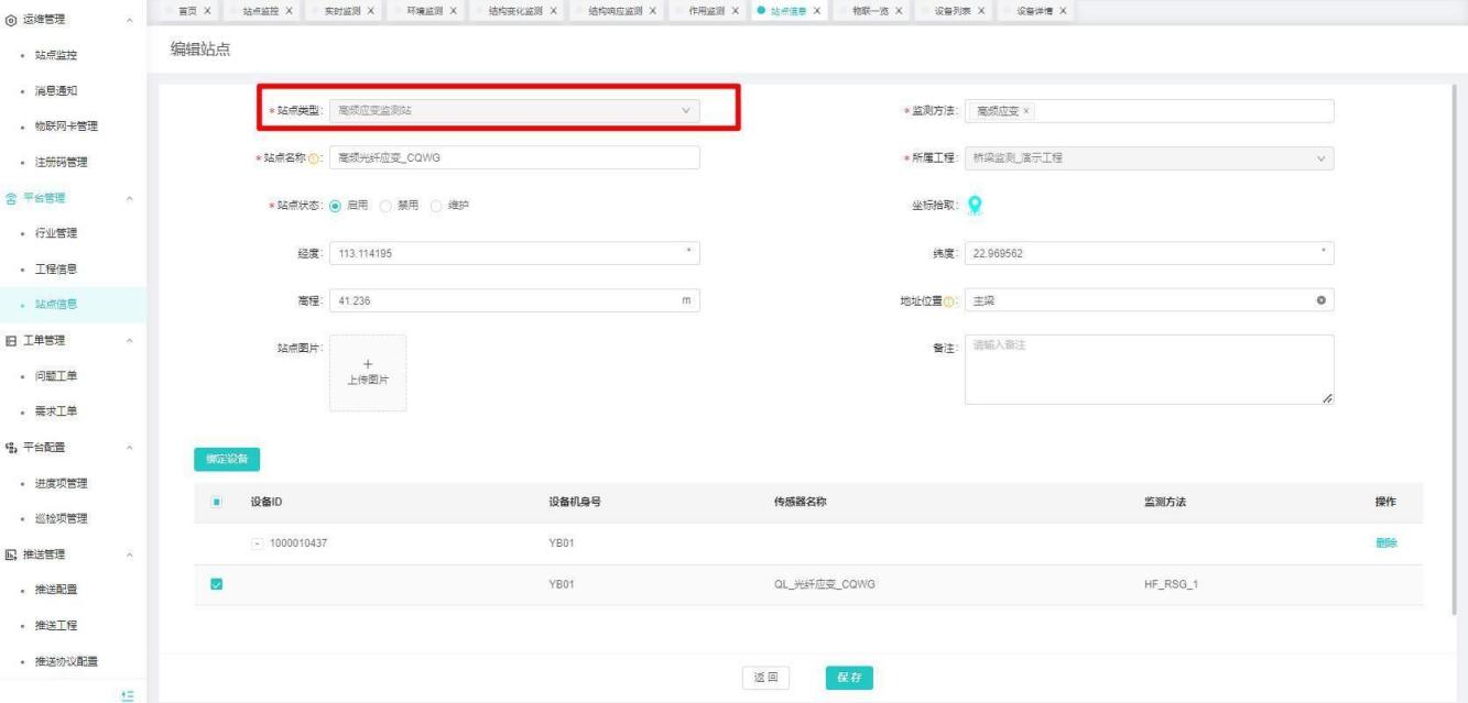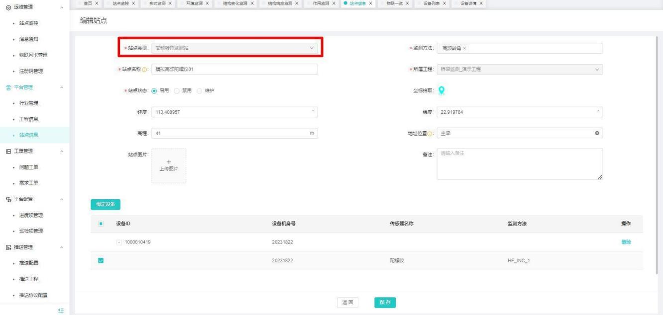 2、进入【运维中心】-平台管理-站点信息,点击【新增】,站点类型选择【静挠度监测站】,绑定设备,选择一个基站和测站,输入正确站点信息,点击【保存】