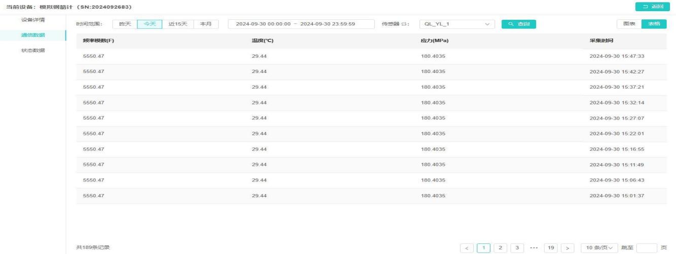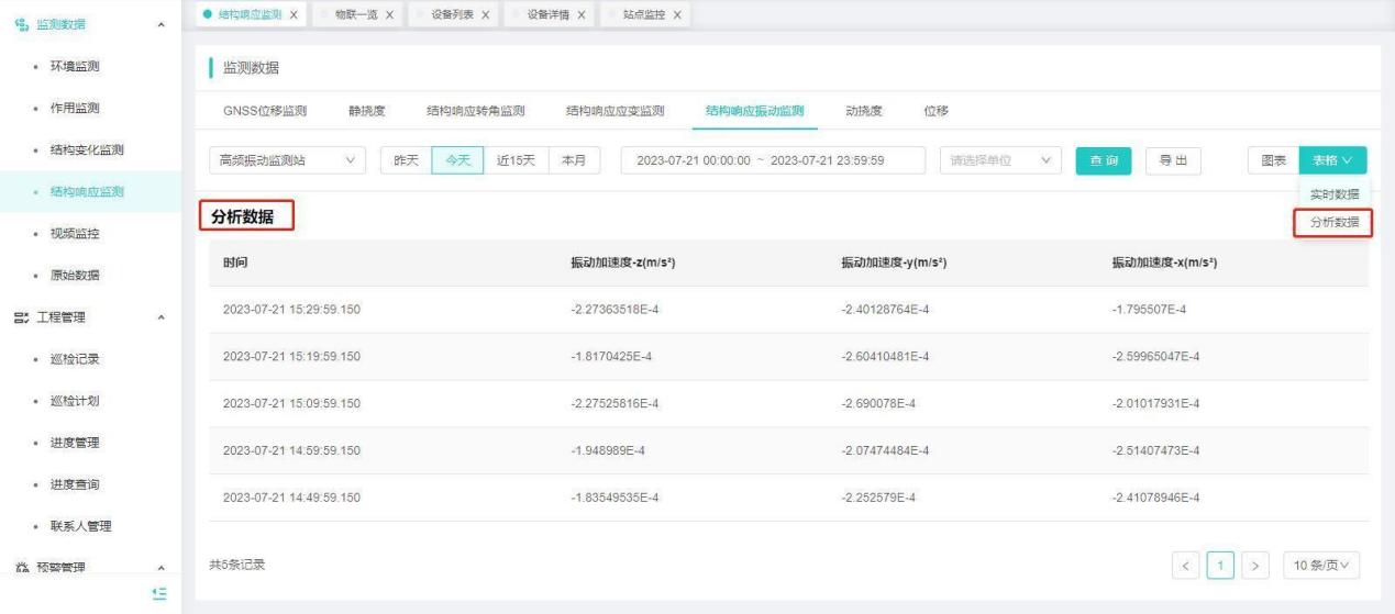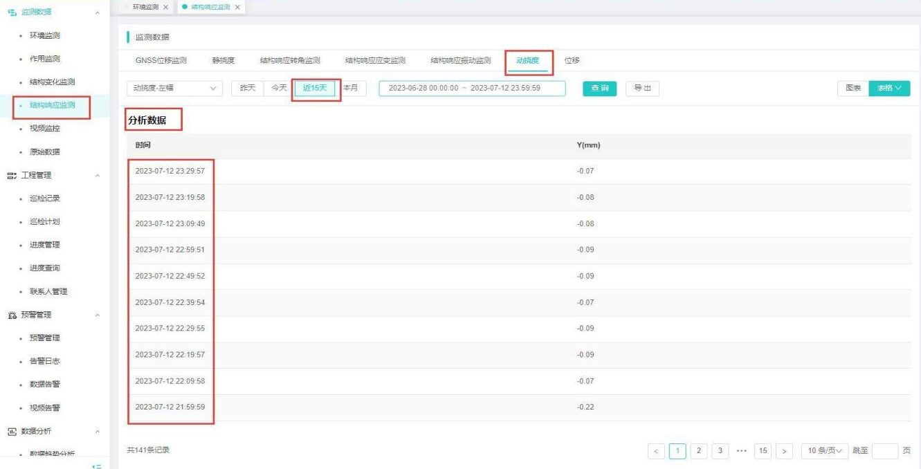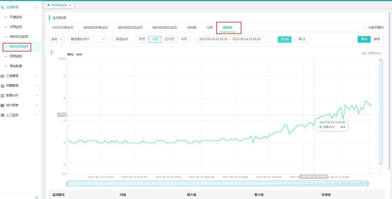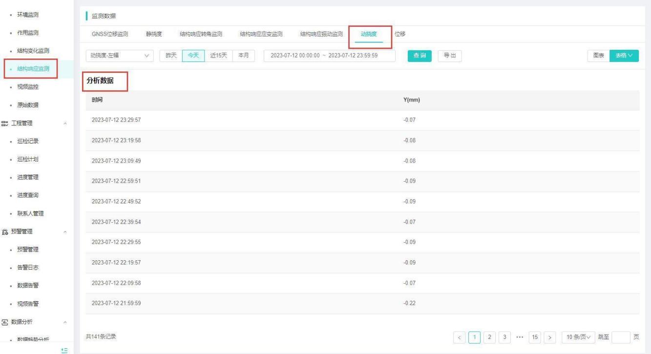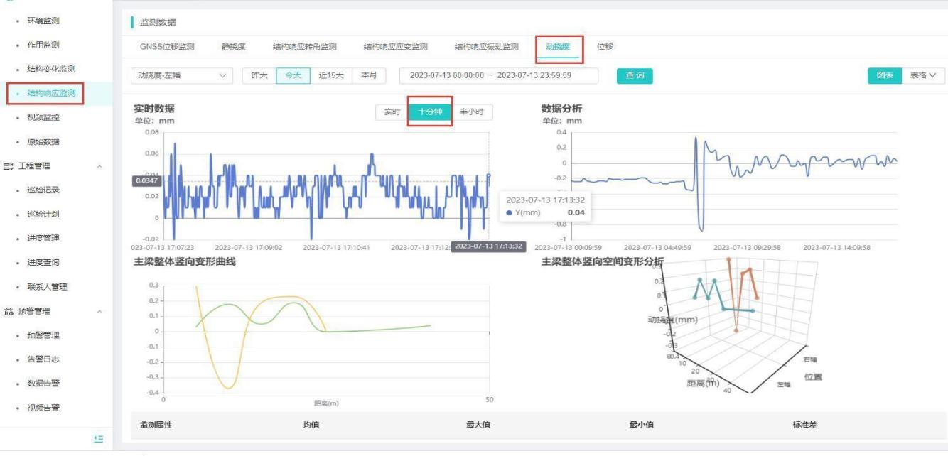 动挠度分析数据:时间维度选择【天的】,图表及表格中,均按10分钟一个数据抽稀展示。