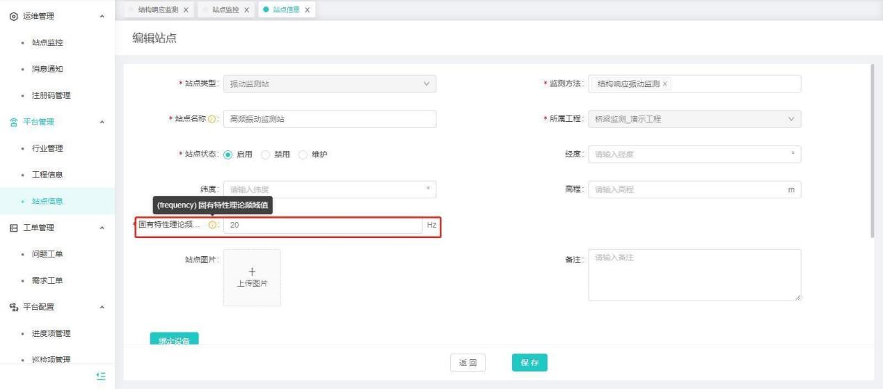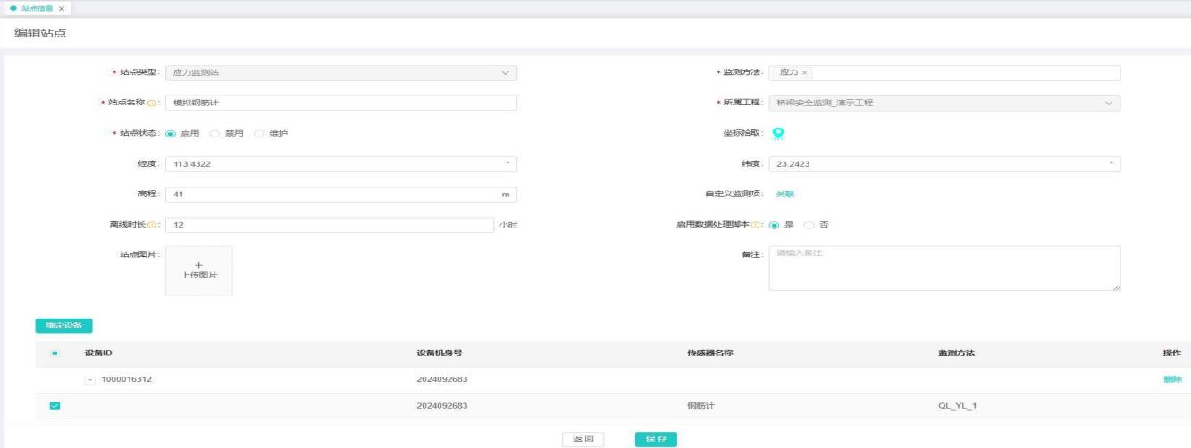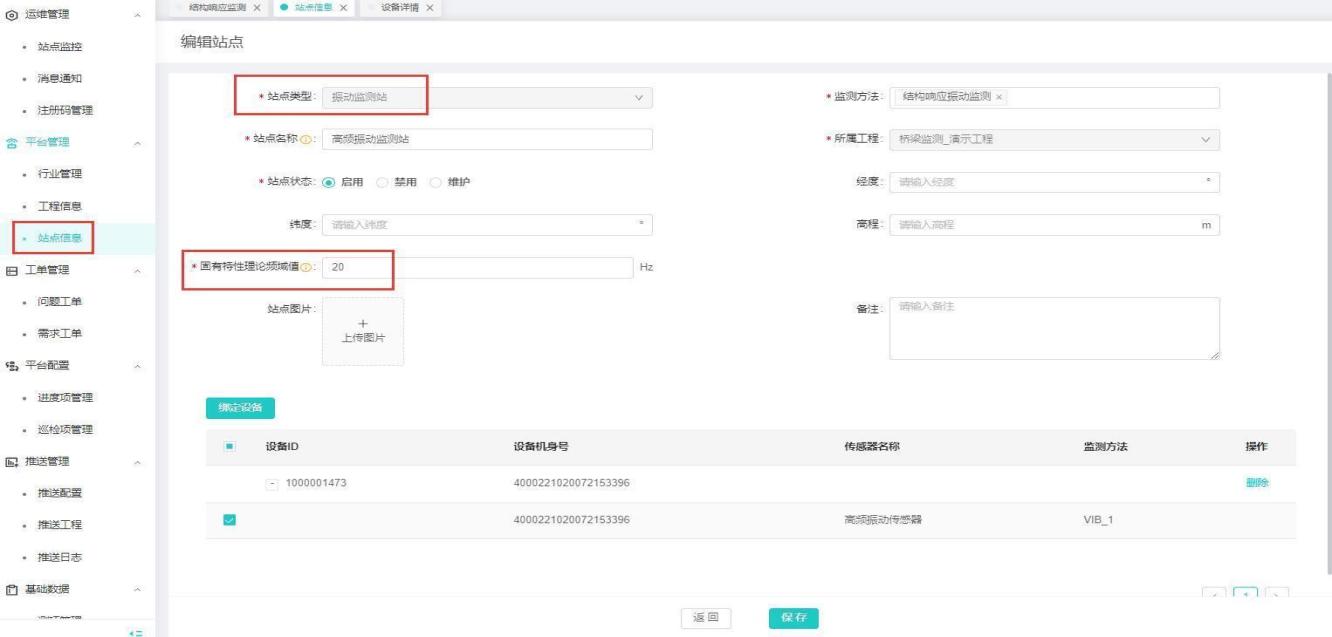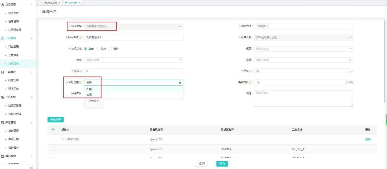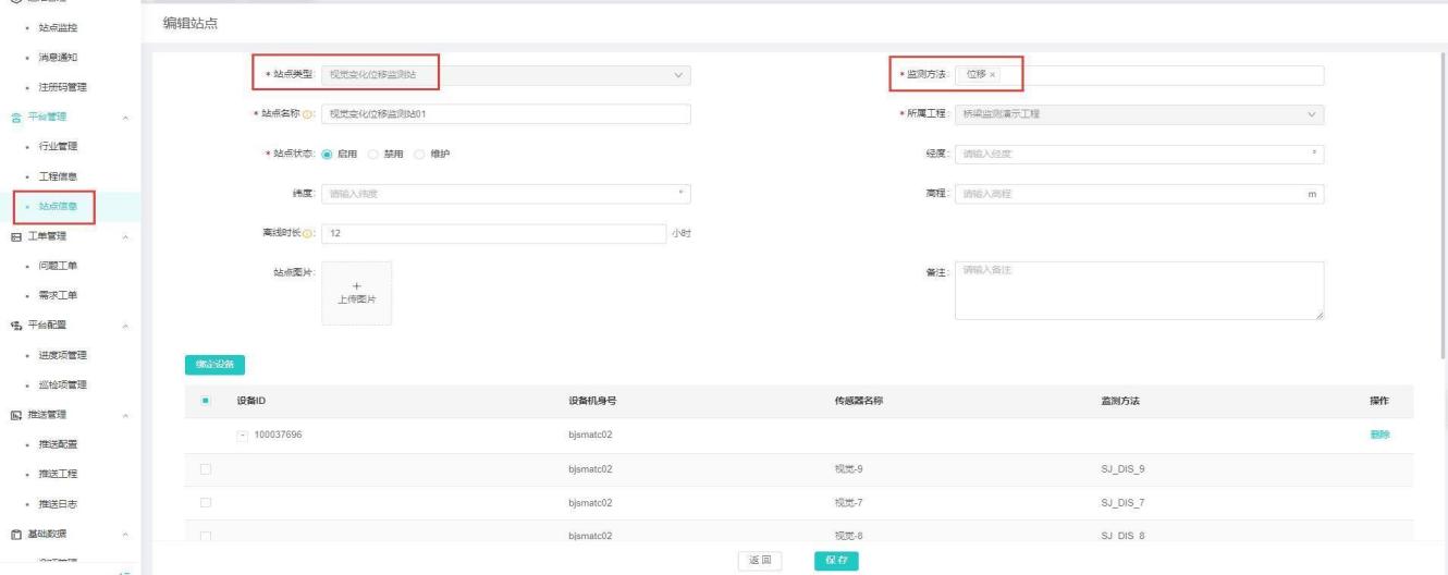 【操作说明】1、顶部导航栏选择【桥梁监测行业】和工程,进入【运维中心】-平台管理-站点信息,点击“新增”,站点类型选择【视觉变化位移监测站】,输入正确站点信息,绑定设备,点击【保存】