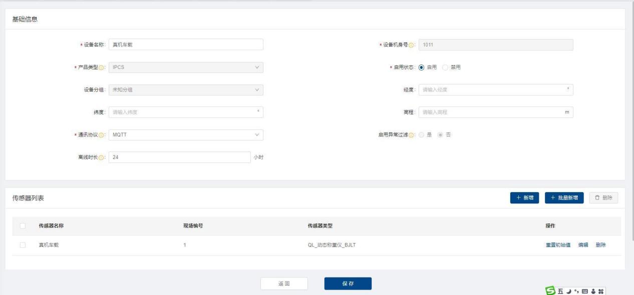 登录平台,选择桥梁监测行业和工程,进入物联中心-设备管理-设备列表,点击“新增”,产品类型选择“IPCS”,填写设备信息,传感器类型选择“QL_动态称重仪_BJLT”,点击“确定”,新增设备成功。