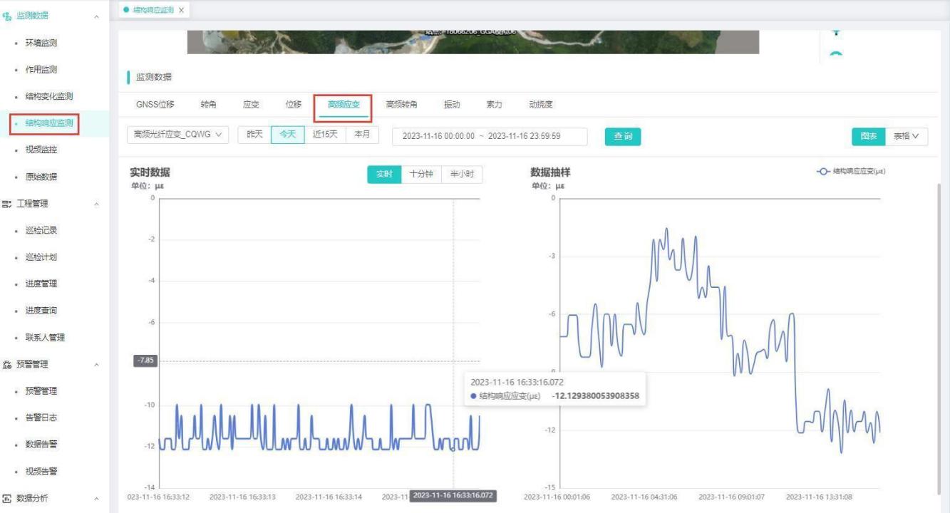 1、可按实时(1分钟)、10分钟、30分钟三个时间维度查询,仅限加载当前应变最新三个时间区间内的高动态实时数据(当前应变高频数据按20HZ显示),不作数据抽稀且不受检索条件的“选择时间段”限制。