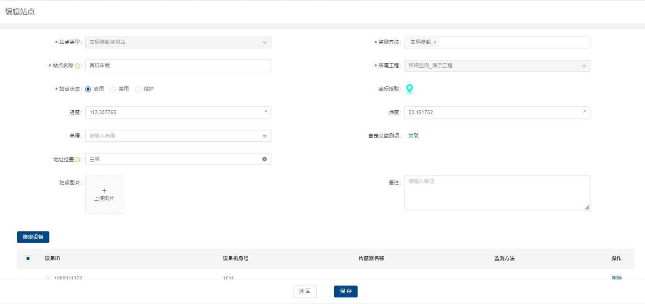 进入运维中心-平台管理-站点信息,点击“新增”,站点类型选择“车辆荷载监测站”,绑定车辆荷载设备,站点新增成功。
