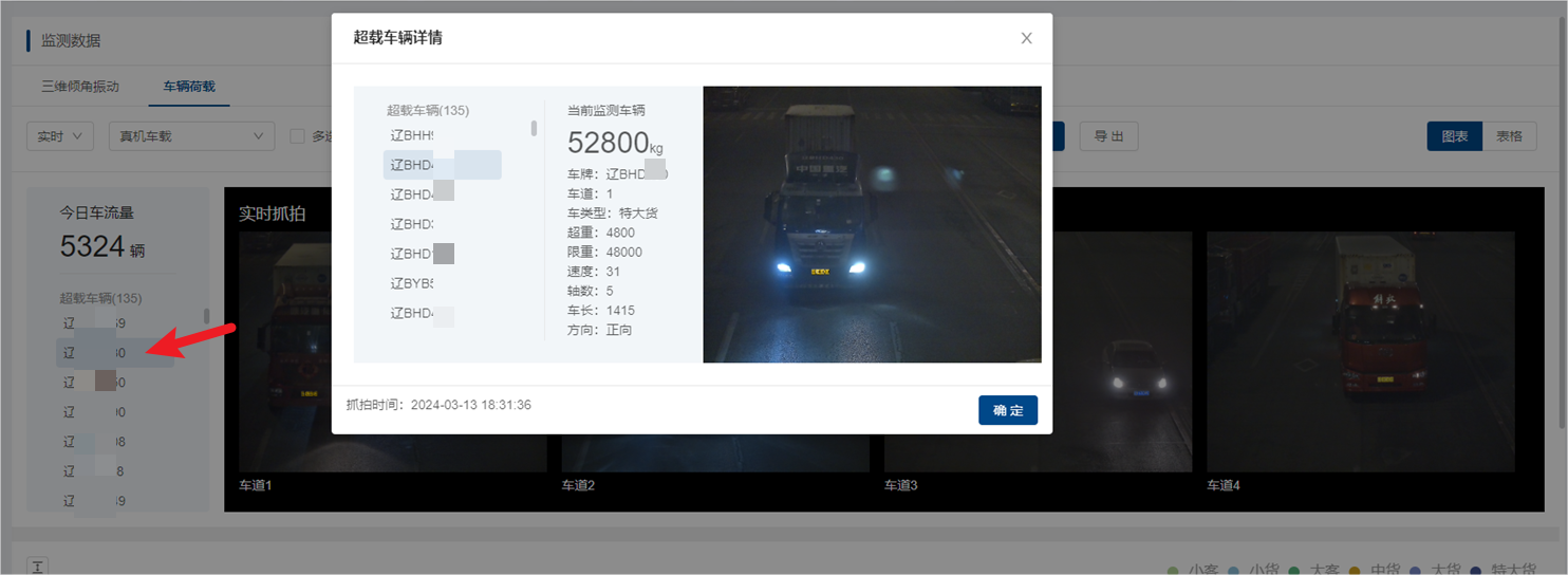 点击“今日车流量”中超载车辆的车牌,查看监测超载车辆的详细信息。