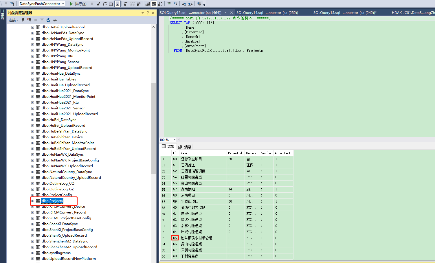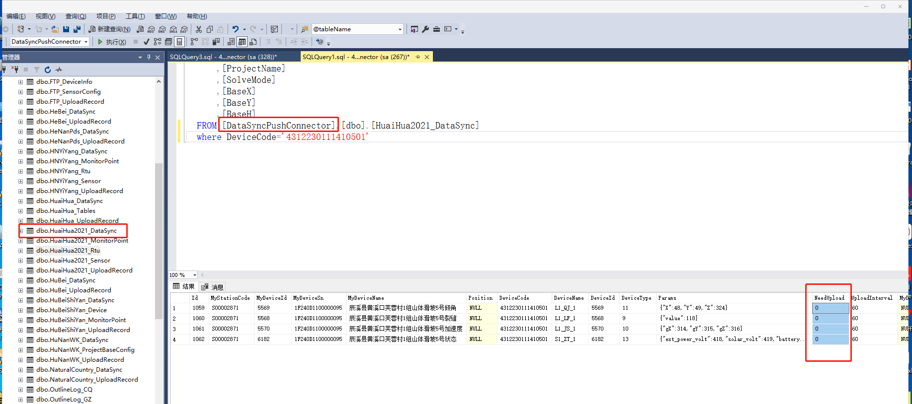 推送状态查询:在DataSyncPushConnector 数据库中,找到项目名+DataSync命名的表,NeedUplot中1代表推送、0代表不推送。