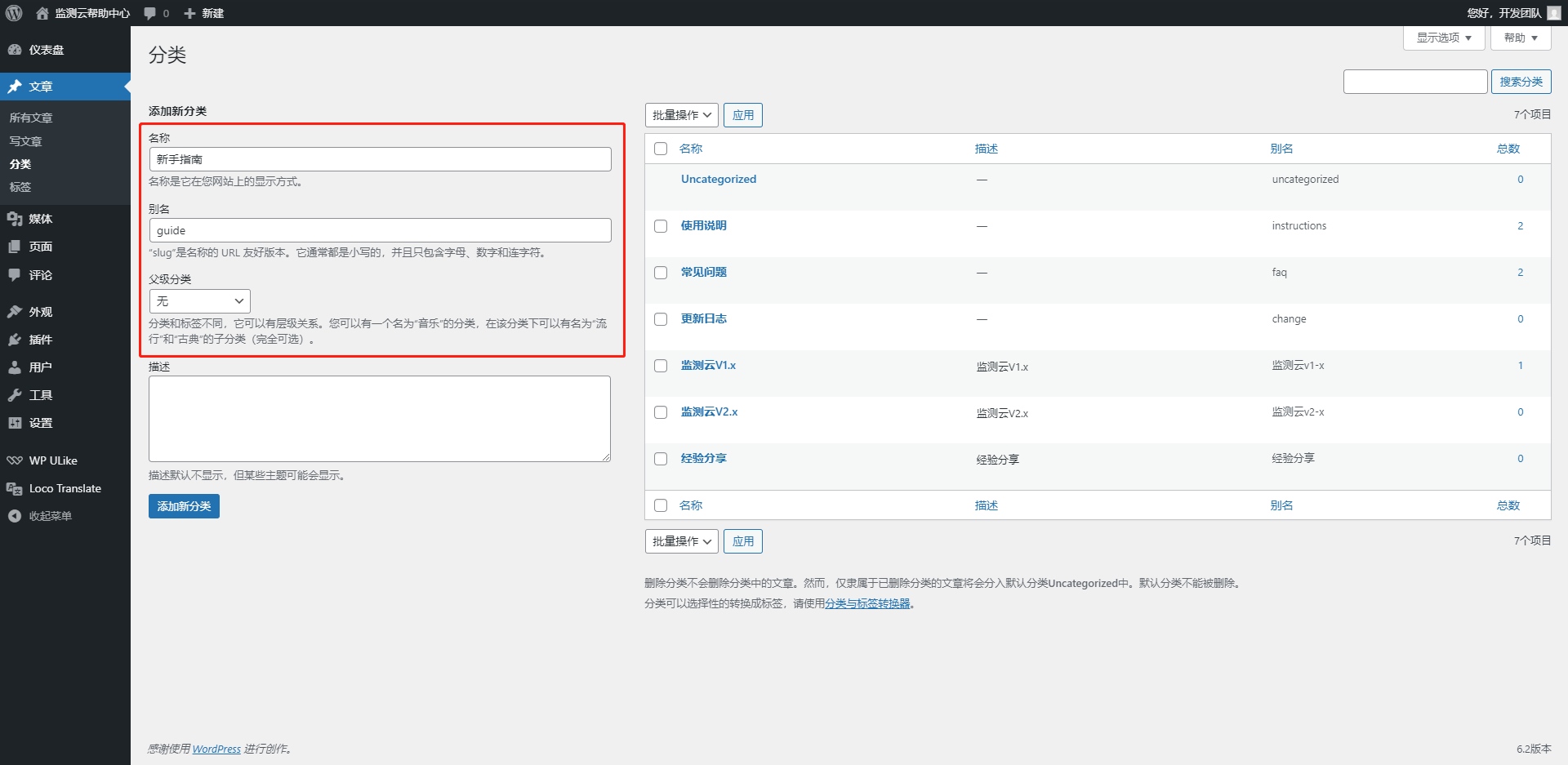- 输入“名称”、“别名”,“别名”用于在URL上展示,如“常见问题”的别名为“faq”,则URL地址为http://help.zhdbds.com/faq