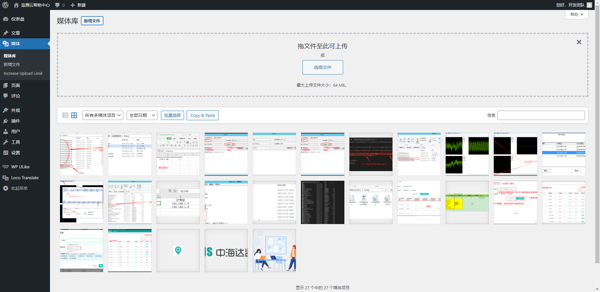 支持在媒体库或文章中上传单个、多个图片,可以使用拖拽或复制粘贴的方式上传