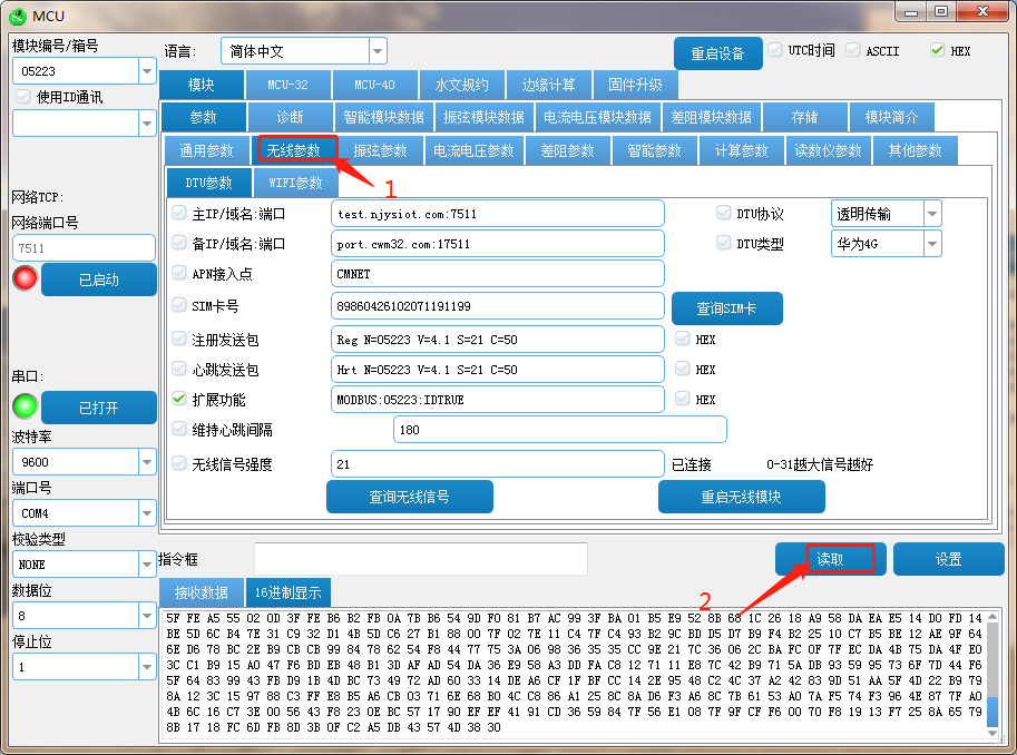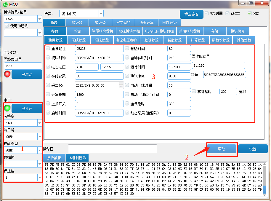 读取配置(选择端口号、波特率打开串口—点击读取)