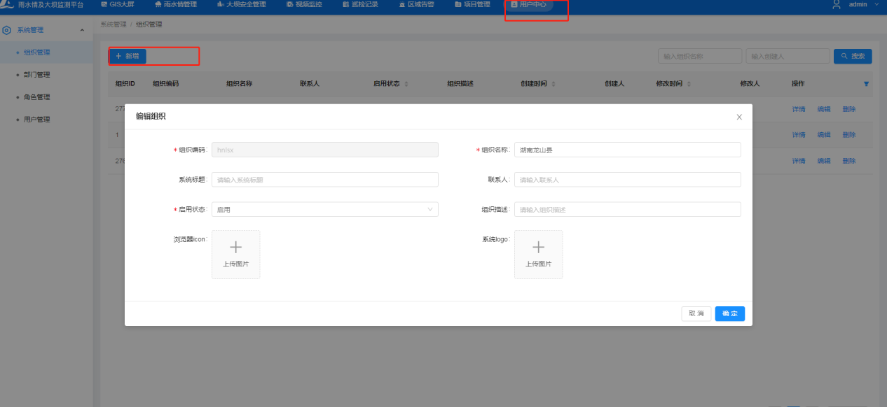 用户中心——组织管理—新建;