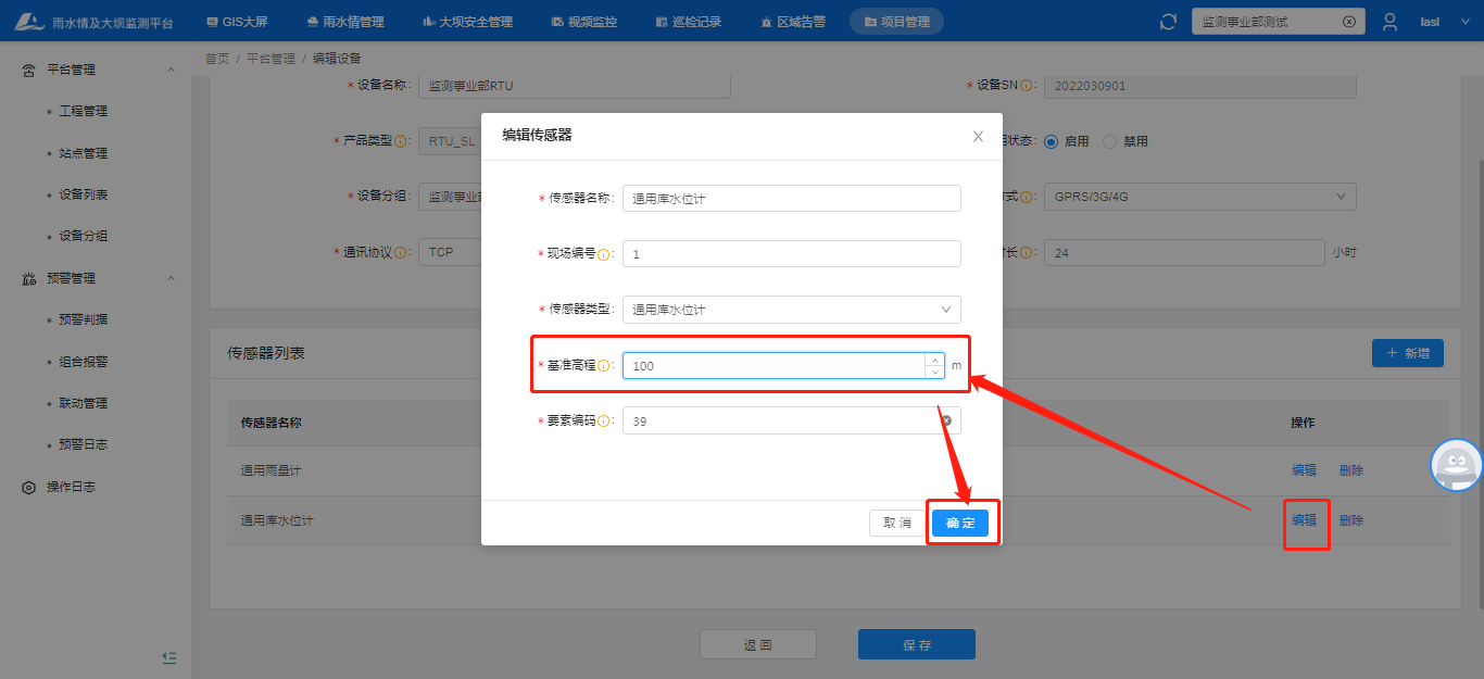 编辑传感器:设备列表—编辑—传感器列表编辑—填写参数—确定—保存;