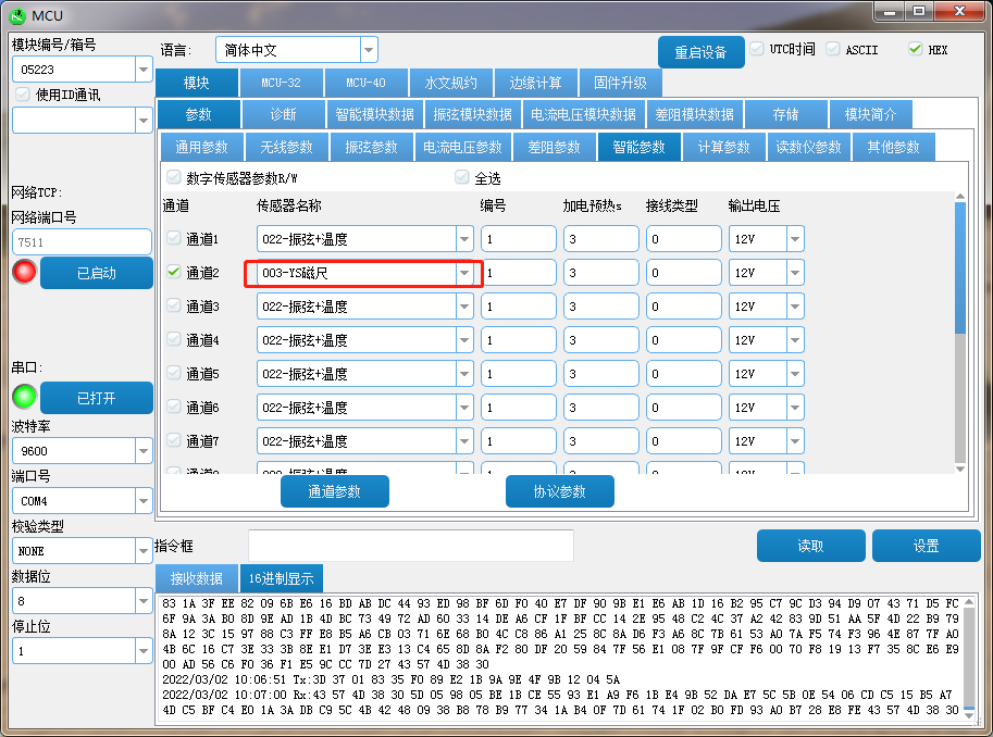 举例;量水堰计接的2通道-,勾选通道2,选择003-YS磁尺,点击设置)