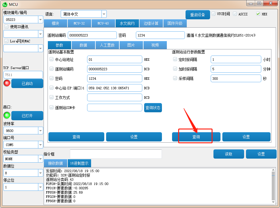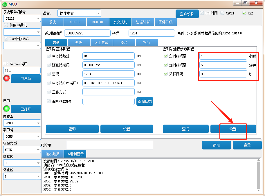 水文规约——参数——查询;勾选定时加报填写定时报间隔“1”加报间隔“5”采样间隔“300”——设置;