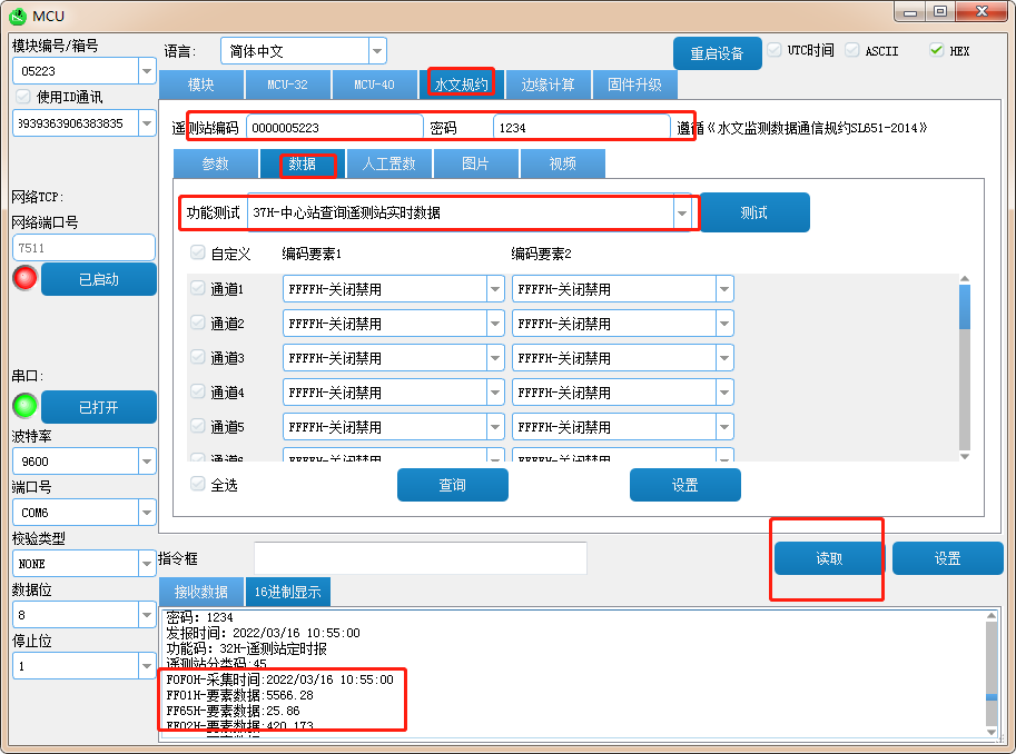 水文规约—数据-选择37H实时数据—测试—查看数据;(记录传感器的初始值和对应的通道数)